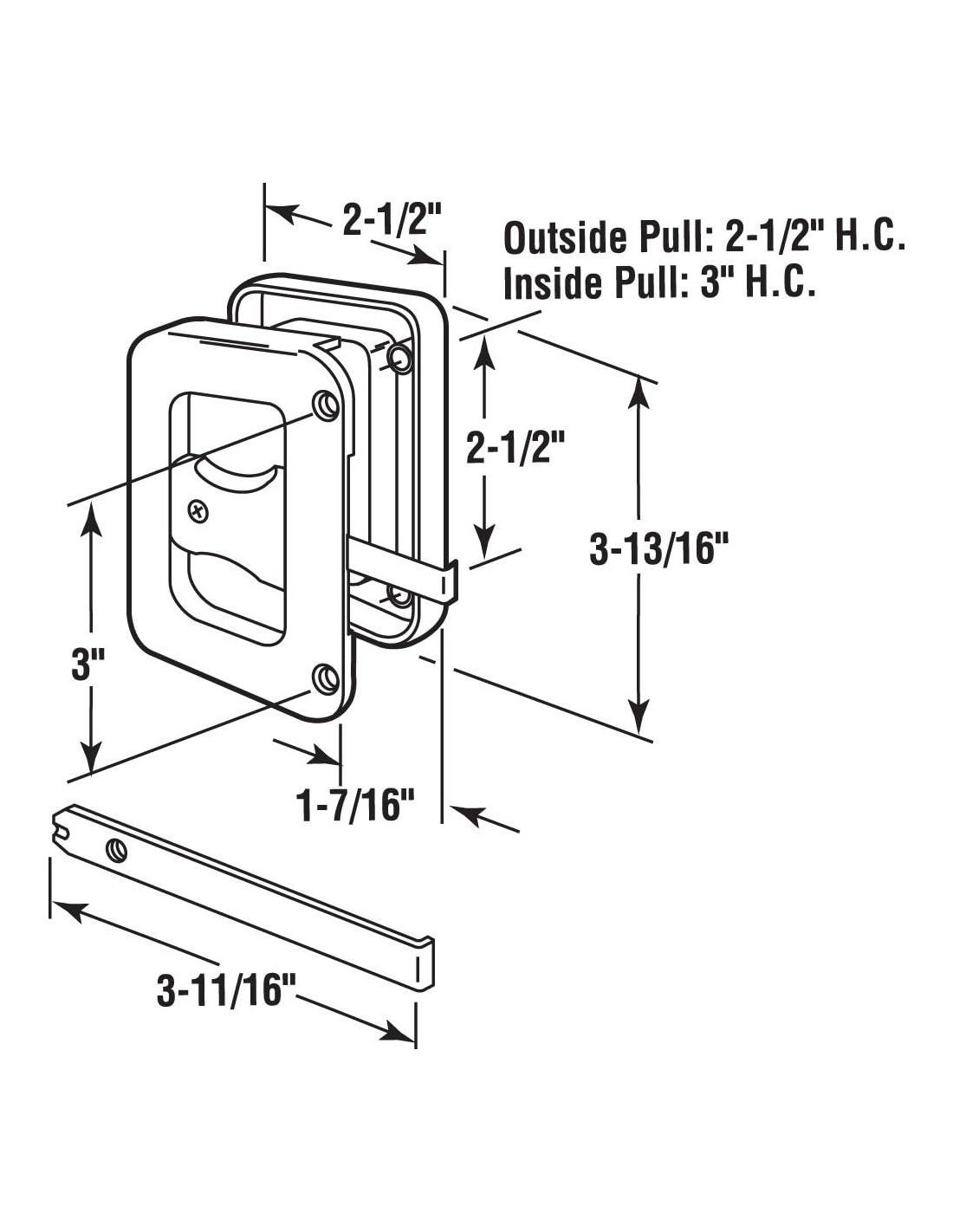 - Asegura la puerta contra aperturas accidentales por el clima o mascotas con orificios de montaje de 2-1/2 pulgadas (6.35 cm) en el centro, el tirador exterior tiene orificios de montaje de 3 pulgadas (7.62 cm) en el centro