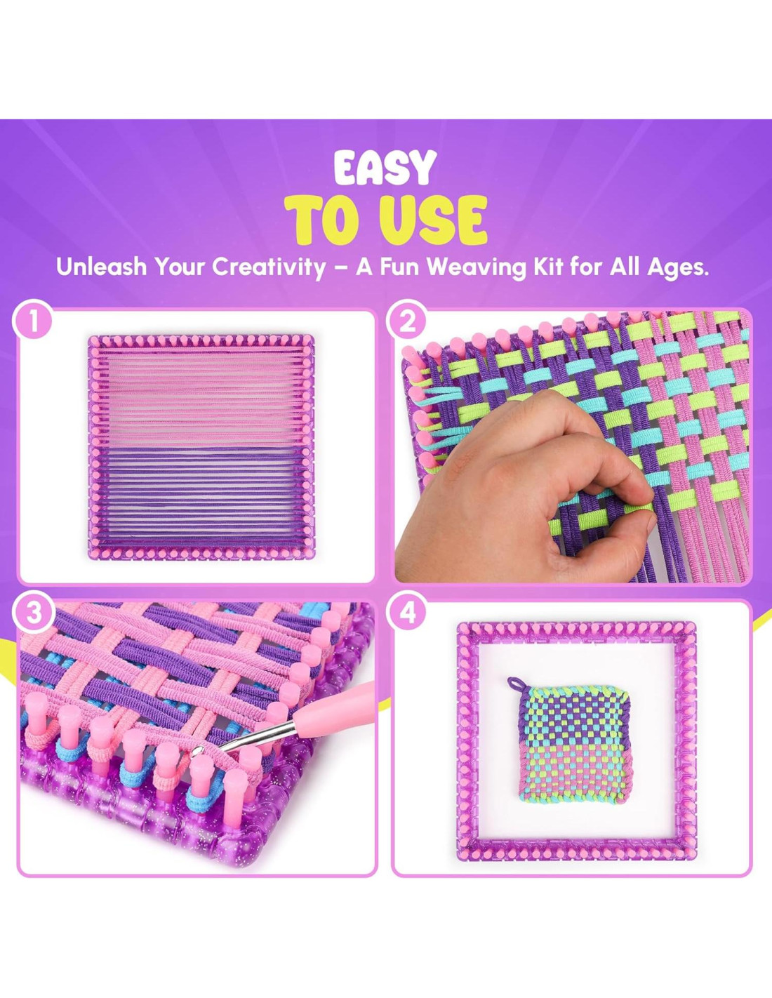 - [KIT TODO EN UNO] Este kit de arte es un kit todo en uno con un marco de telar resistente, 288 bucles de manualidades suaves y elásticos en 12 colores deslumbrantes, pines bloqueables, un gancho, un manual de instrucciones paso a paso y una bolsa de almacenamiento portátil para llevar el kit a cualquier lugar y comenzar a crear. La rica variedad de artesanías tejidas se adapta a tus diversas necesidades de manualidades para agregar más disfrute a tus actividades de creación.