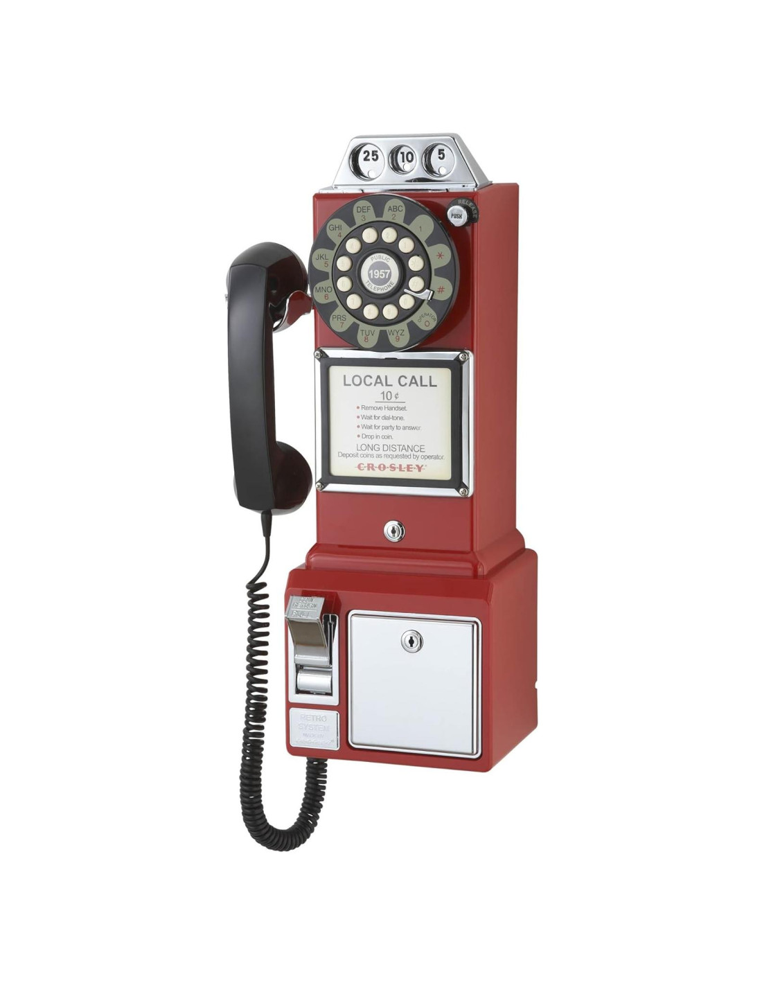 - DIVERSIÓN RETRO: Basado en diseños de teléfonos públicos vintage, este teléfono de pared para el hogar es completamente funcional, incluyendo una caja de monedas operativa para autenticidad
