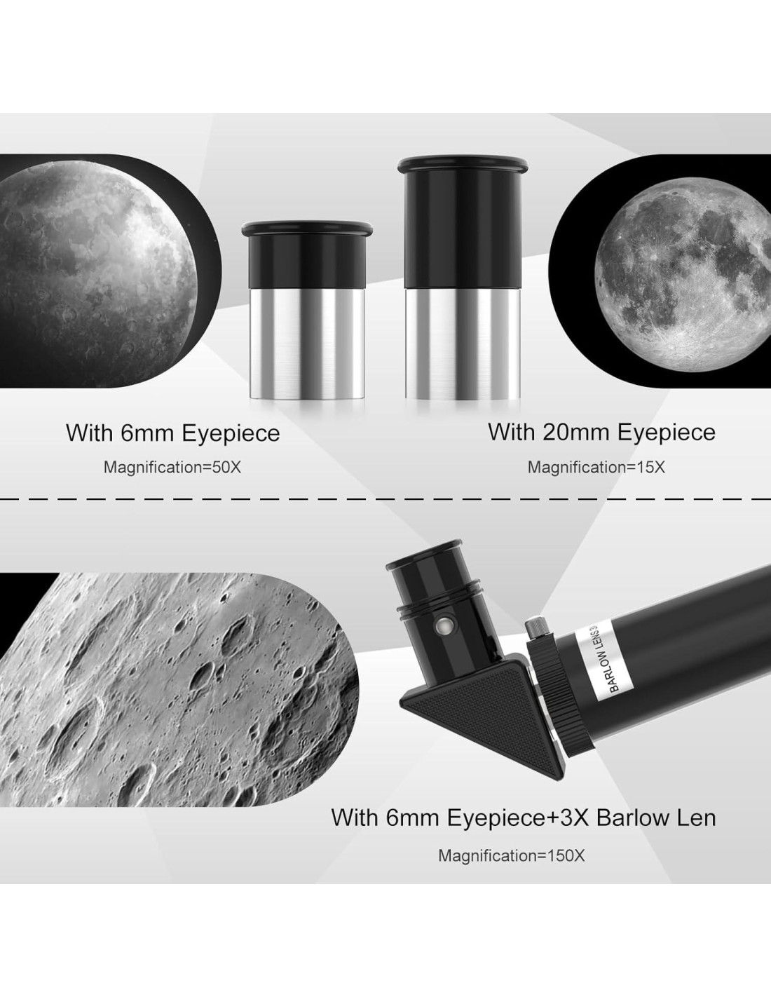 - Magnificación de 15X-150X: Nuestro telescopio refractor está equipado con dos oculares (H20mm y H6mm) y una lente Barlow de 3X. La lente Barlow de 3X triplica el poder de magnificación de cada ocular. Así que puede obtener una magnificación de 15X a 150X. Ya sea observando estrellas y la luna por la noche o observando planetas, el telescopio ToyerBee es el mejor ayudante para niños, adultos y principiantes en astronomía.