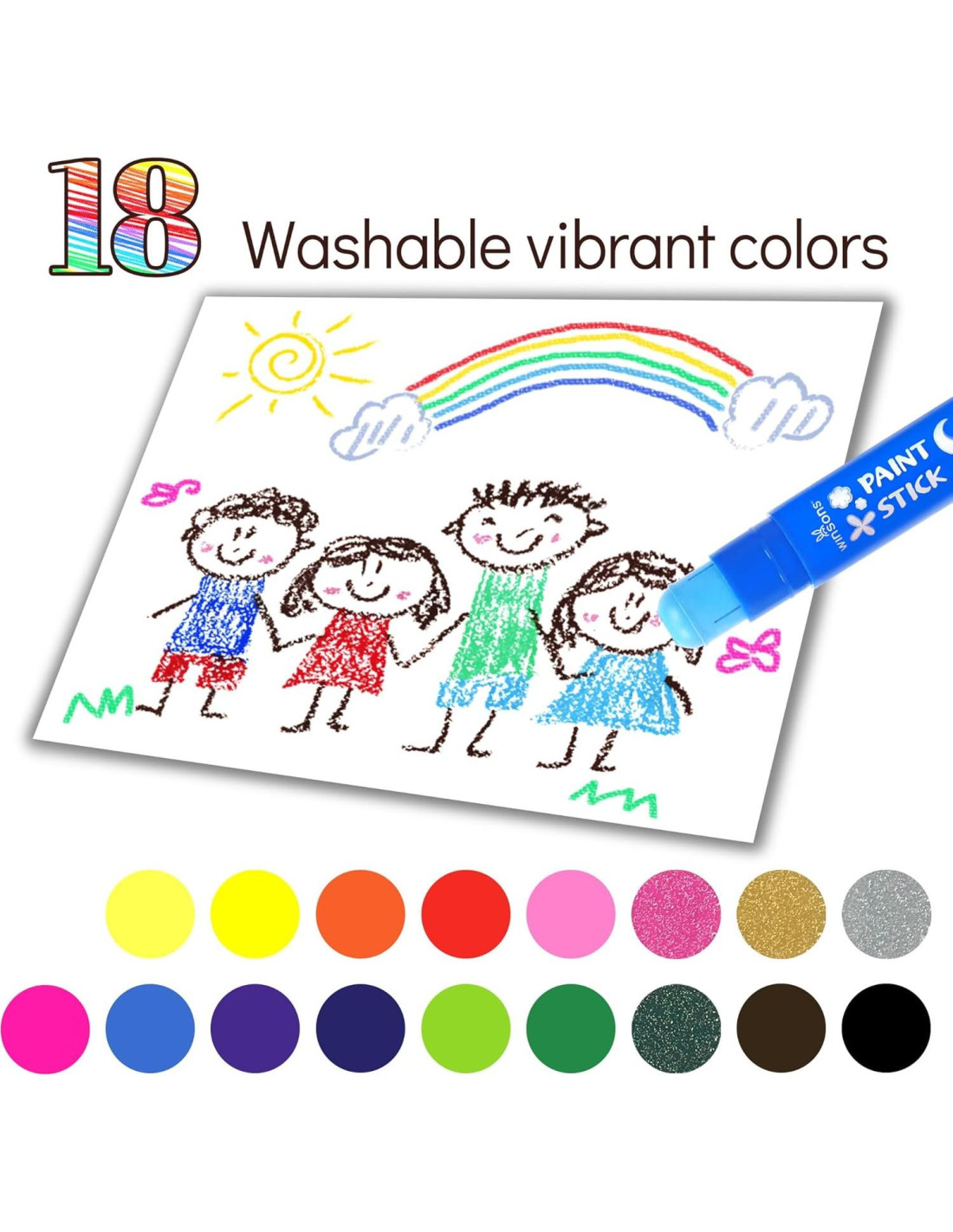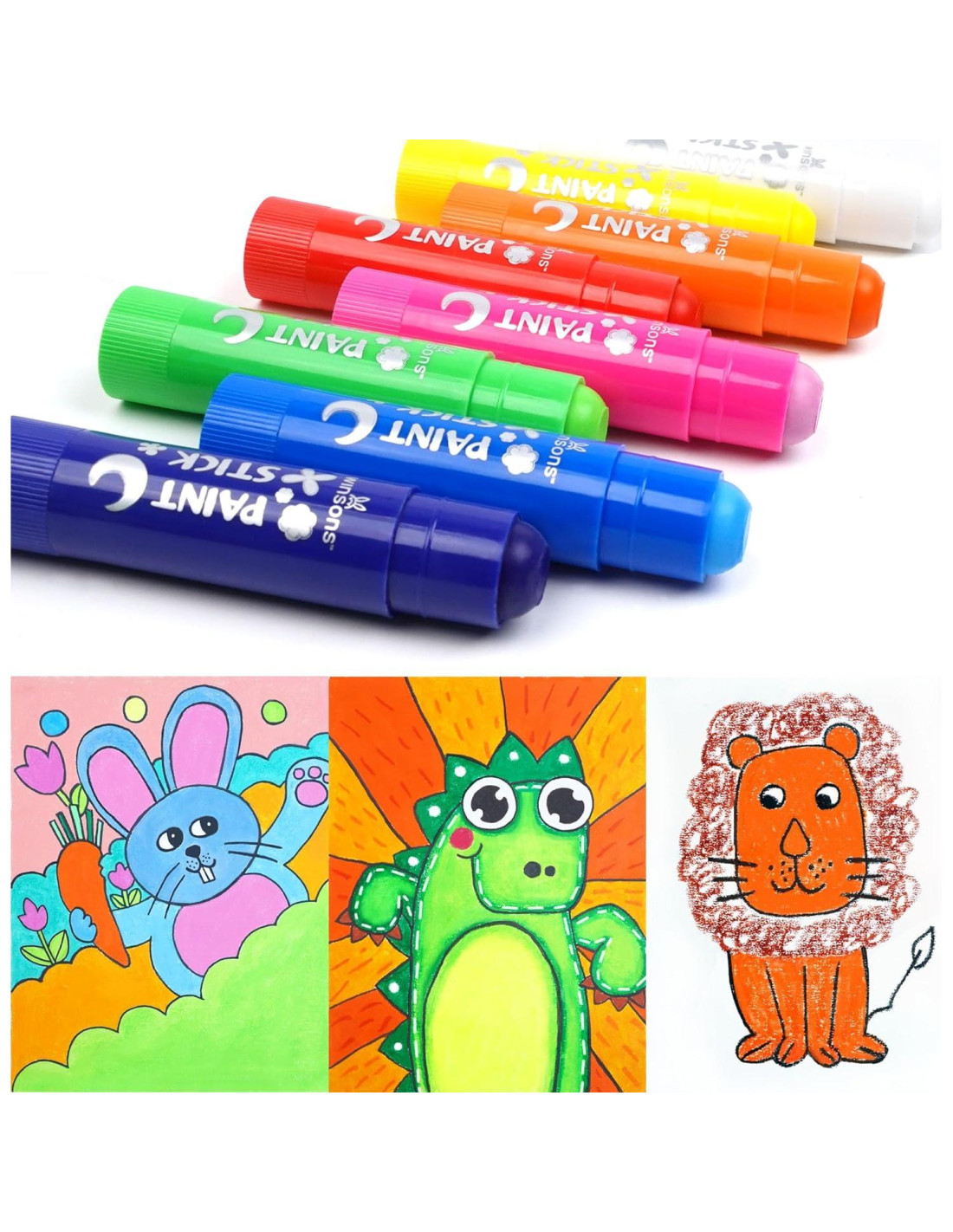 - [COLORES VIBRANTES Y BRILLANTES] Nuestras barras de pintura lavables ofrecen un fuerte colorido, y se pueden superponer y mezclar para crear colores y efectos únicos. Estas barras de pintura sólidas pueden trabajar en varias superficies como papel, madera, construcción, tela y más. Suministros de arte versátiles para que los niños exploren su creatividad.