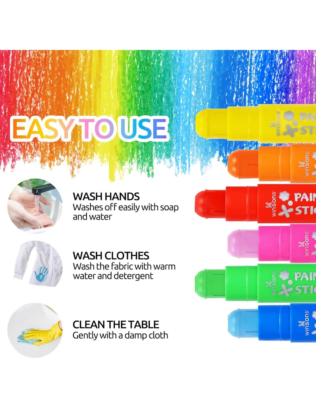 - [BARRAS DE PINTURA LAVABLES] Nuestras barras de pintura para niños son lavables y solubles en agua. Simplemente usa un paño húmedo o una toalla de papel para limpiar cualquier exceso de pintura. Se lava fácilmente de la piel y la mayoría de las telas para una limpieza sin complicaciones. Gran colección de suministros de arte para niños y aulas.