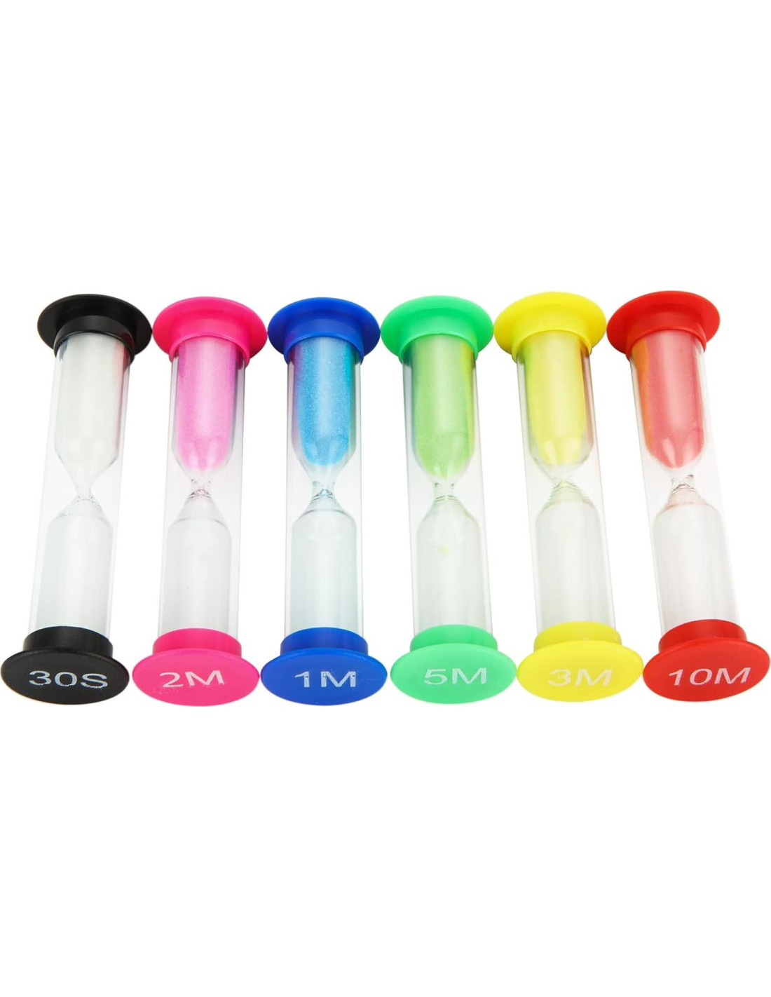 Juego de 36 Temporizadores de Arena para Niños, Set de Reloj de Arena de Plástico 30s / 1min / 2min / 3min / 5min / 10min para Aula, Cocina, Juegos, Oficina, Hogar Característica Multipropósito Nuestros temporizadores de arena de colores se pueden usar como temporizador para cepillarse los dientes, temporizador de estudio, temporizador de cocina, temporizador de yoga. Los temporizadores pueden ayudarte a hacer cada cosa mejor. Temporizadores de arena coloridos son de diferentes colores. Son grandes visuales para los niños. Contando el Tiempo 30 segundos, 1 minuto, 2 minutos, 3 minutos, 5 minutos, 10 minutos. (Por favor, ten en cuenta que este temporizador de reloj de arena no es un dispositivo de precisión, por lo que habrá una pequeña desviación de tiempo.) Especificación: Material: ABS, Vidrio y Arena Tamaños: 3.5 X 1 pulgadas (8,89 cm x 2,54 cm) Paquete Incluye: 36xTemporizador de Arena Tiempo: 30s / 1min / 2min / 3min / 5min / 10min Color: Negro, Azul, Rosa, Amarillo, Verde, Rojo