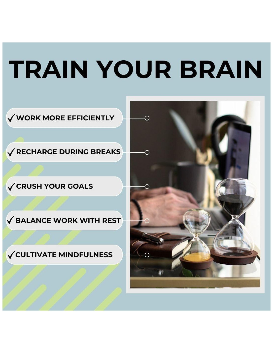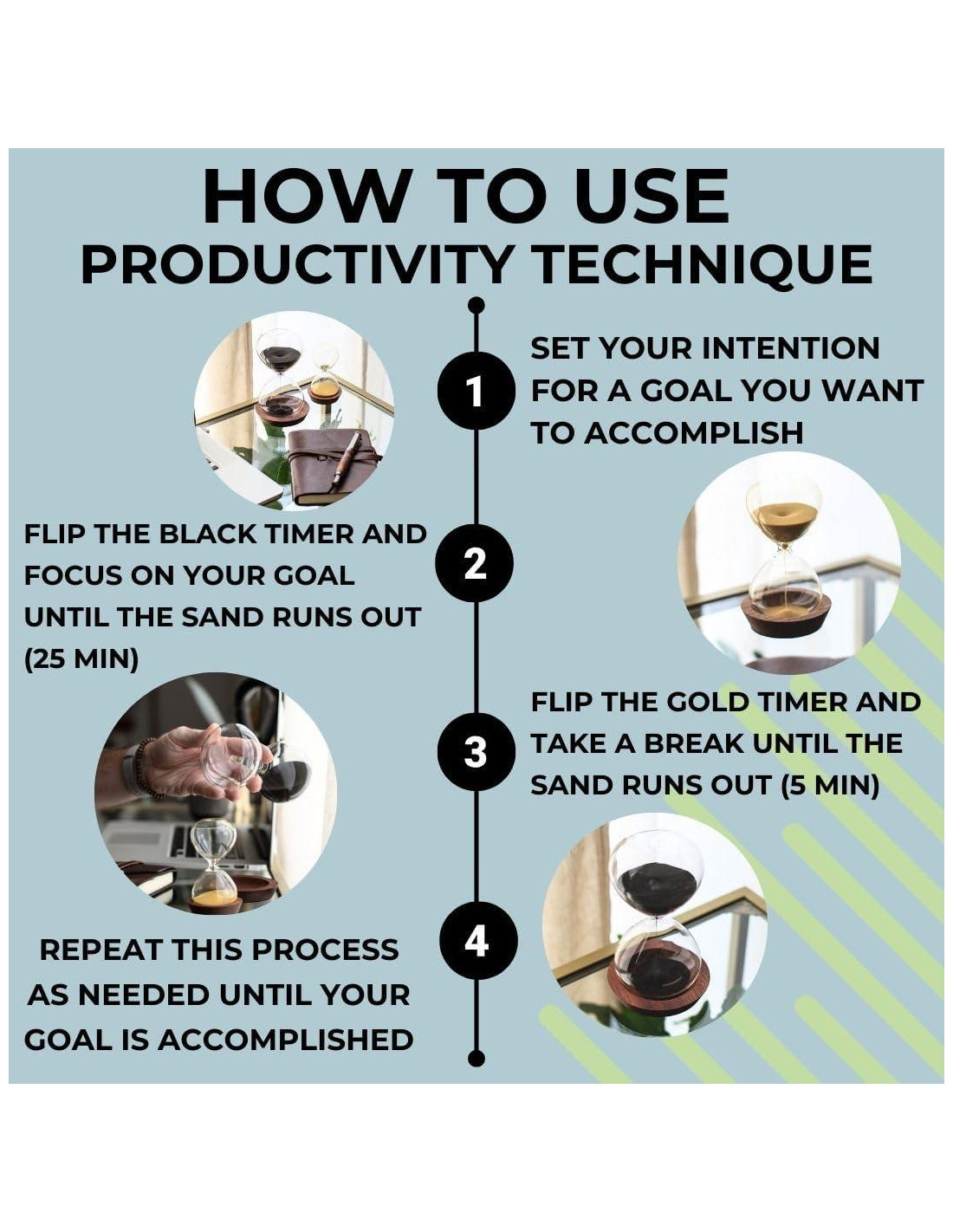 - Mejore sus habilidades de gestión del tiempo: Use el temporizador de arena negro durante 25 minutos de enfoque ininterrumpido, luego use el temporizador de arena dorado durante 5 minutos de relajación. Repetir este proceso a lo largo de la tarea en cuestión entrena a su cerebro para trabajar de manera más eficiente y recargarse durante los descansos.