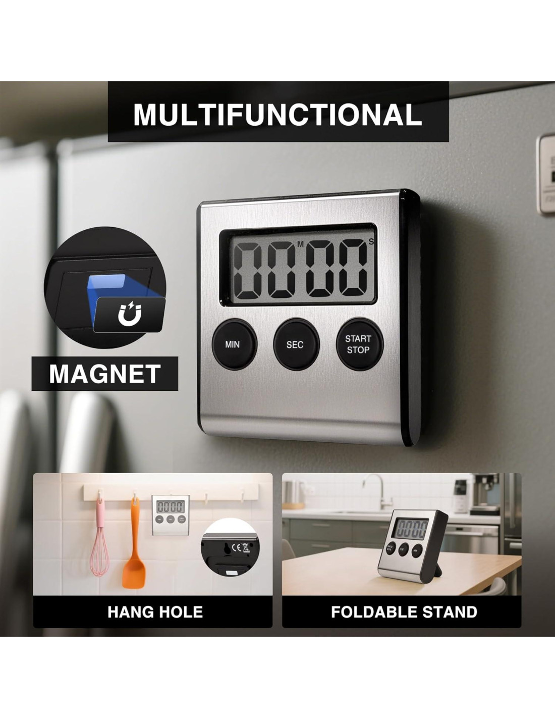 - El temporizador magnético súper fuerte es un excelente ahorrador de espacio en el mostrador. También se puede colgar o colocar con un soporte plegable.