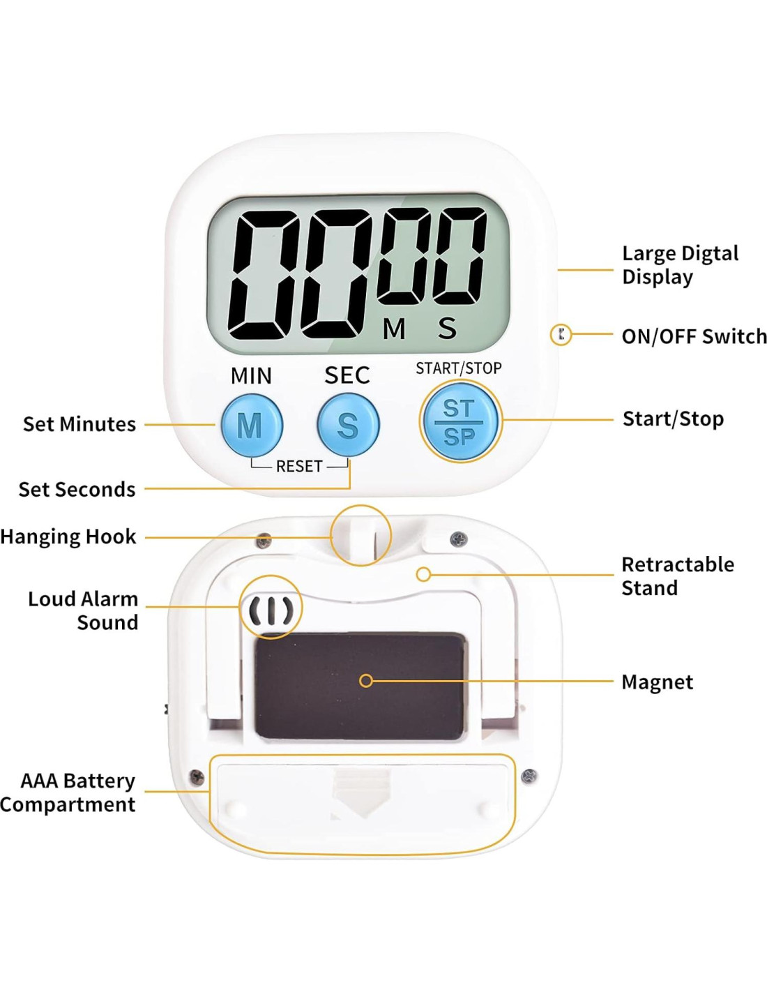 Color: Blanco Unidades de Tiempo: Minutos (M), Segundos (S) Tiempo Máximo: 99 minutos, 59 segundos Duración del Sonido de Alarma: 60 segundos Tamaño: 7.01 x 6.50 centímetros Potencia: 1 x batería AAA (No incluida) ¿Por qué elegir nuestro temporizador digital? El tiempo máximo es de 99 minutos 59 segundos, satisface perfectamente la necesidad de actividades en el aula y después de la escuela, gran temporizador de cuenta atrás / cuenta atrás para maestros y niños. El diseño simple hace que cocinar sea mucho más fácil. Diverso y decorativo: El temporizador tiene un soporte plegable para colocarlo en la mesa. Respaldo magnético para colocarlo en el refrigerador y gancho para colgar. El temporizador visual es atractivo y fácil de usar. Claro, la mayoría de los cocineros modernos tienen temporizadores, pero los dígitos suelen ser pequeños para leer, la alarma no es tan fuerte y no puedes mover el temporizador a la siguiente habitación para mantenerlo a la vista. El mejor temporizador digital para tus necesidades. ¡Es una elección increíble! Contenido del paquete: 1x Temporizador Digital 1x Manual del Usuario Servicio de Calidad: Cada uno de nuestros temporizadores es cuidadosamente probado y rigurosamente empaquetado, ordena con confianza, ¡haz clic y añade al carrito ahora!