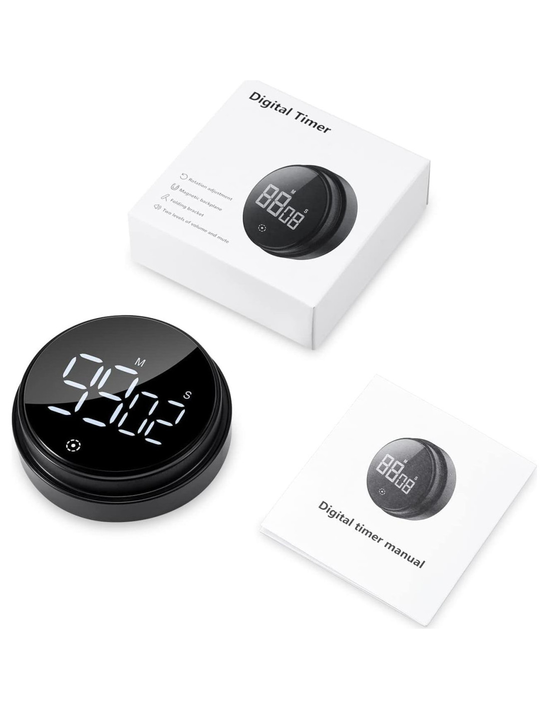 Ya sea un temporizador de cocina o para trabajo y estudio, así como deportes y fitness/yoga, belleza, juegos, etc., te ayuda a llevar un tiempo preciso y es alimentado por 3 baterías AAA. 1. Mantén presionado el botón durante 3s para reiniciar a 00:00. 2. Presiona brevemente para comenzar a contar. 3. Gira la perilla para ajustar el tiempo. (La rotación en sentido horario aumenta y la rotación en sentido antihorario disminuye) 4. Presiona el botón para iniciar/pausar. 1. El temporizador está ensamblado con dos imanes traseros, que se pueden fijar en superficies metálicas similares al hierro o colocar en el escritorio con el soporte inclinado a 60 grados. 2. En estado de funcionamiento, el modo de ahorro de energía no necesita operación, el brillo de la pantalla se reducirá automáticamente después de 5 segundos, y luego la pantalla se apagará automáticamente después de 5 segundos. 3. Modo brillante prolongado sin operación, el brillo de la pantalla se reducirá automáticamente después de 5 segundos, y la pantalla se apagará automáticamente después de 55 segundos. 1*Temporizador Negro (Sin Baterías). 1* Manual en Español 1. Gira la perilla para establecer el tiempo de cuenta regresiva requerido, gira en sentido horario para aumentar el valor y gira en sentido antihorario para disminuir el valor. (Cuando gires rápidamente y el ángulo de rotación exceda los 50 grados, puedes establecer rápidamente el valor de los minutos, y luego girar la perilla después de un intervalo de aproximadamente 1 segundo para ajustar finamente el valor de los segundos.) 2. Después de completar la configuración, presiona para iniciar la cuenta regresiva. Después de que la cuenta regresiva se complete, la pantalla parpadeará 00:00 y habrá un sonido de aviso "dididi". El sonido de aviso durará un minuto. Presiona para detener el sonido de aviso. 3. Durante la cuenta regresiva, presiona brevemente para pausar. Después de que la cuenta regresiva esté en pausa, mantén presionado para reiniciar, y mostrará 00:00. 1. Cuando la pantalla muestre 00:00, presiona para iniciar la configuración del temporizador, y luego presiona brevemente para pausar. 2. Después de que el temporizador esté en pausa, mantén presionado para reiniciar, y la pantalla mostrará 00:00. Si el temporizador alcanza 99 minutos y 55 segundos, habrá un pitido "di di di", y la pantalla parpadeará. Presiona para detener el pitido.