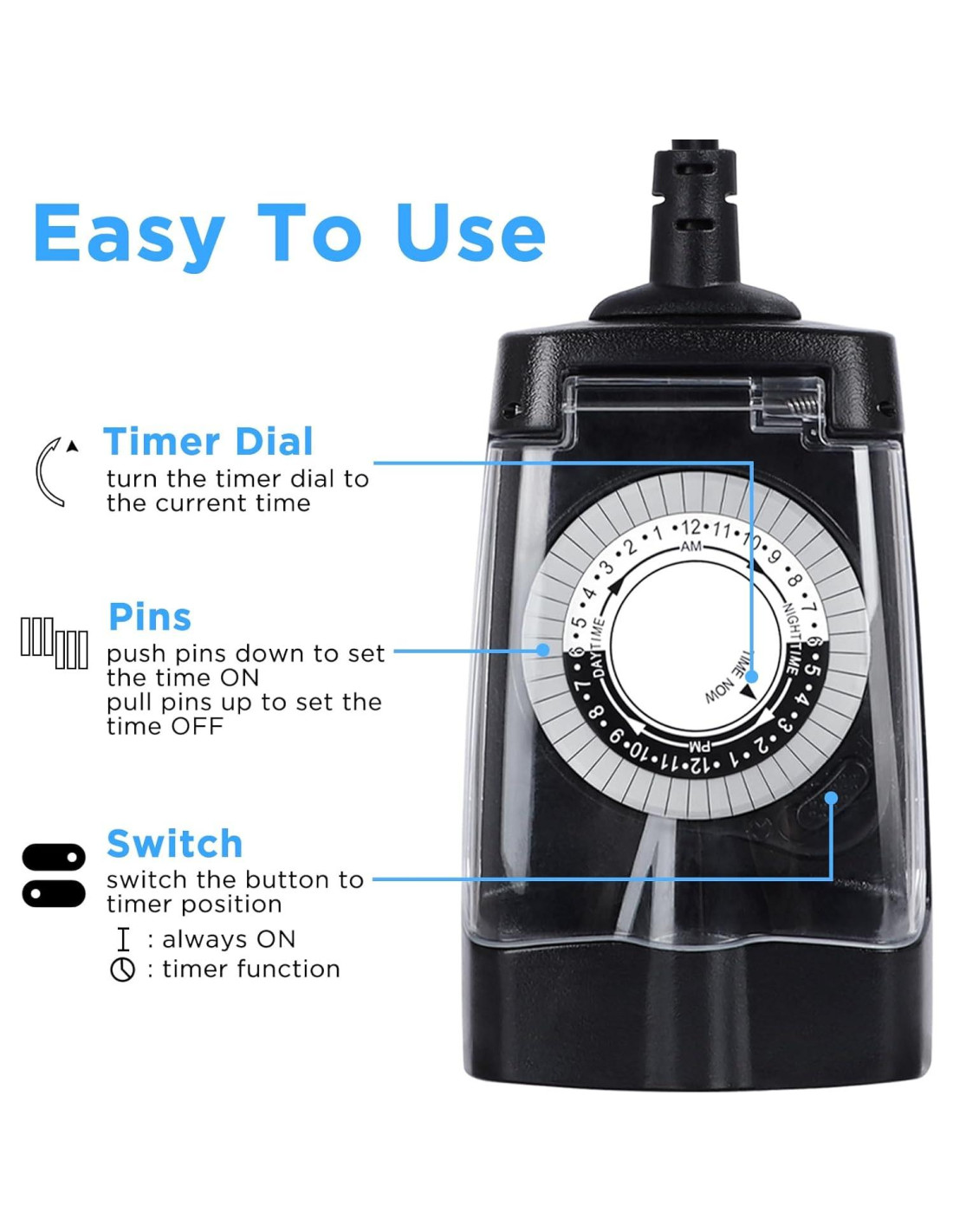 - [Temporizador de Luz Exterior de Repetición Diaria de 24 Horas] Este temporizador exterior de alta resistencia para luces con intervalos de 30 minutos, ofrece hasta 48 opciones de configuración. Un interruptor deslizante puede alternar entre el modo temporizador y el modo siempre-ENCENDIDO. Está diseñado para controlar la iluminación exterior, riego de jardines, fuentes, bombas de piscina, farolas, luces de seguridad, calentadores de bloque de motor y más.
