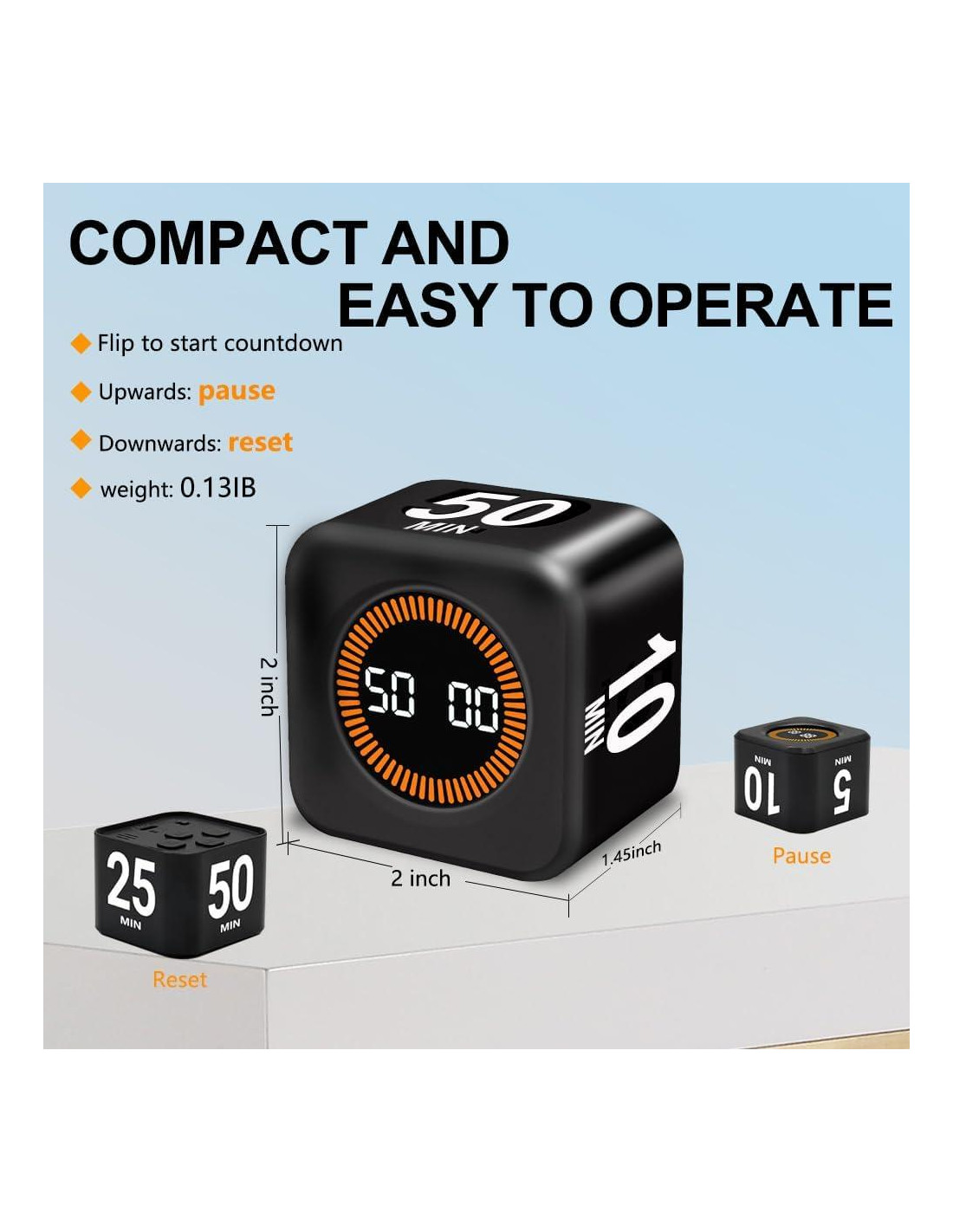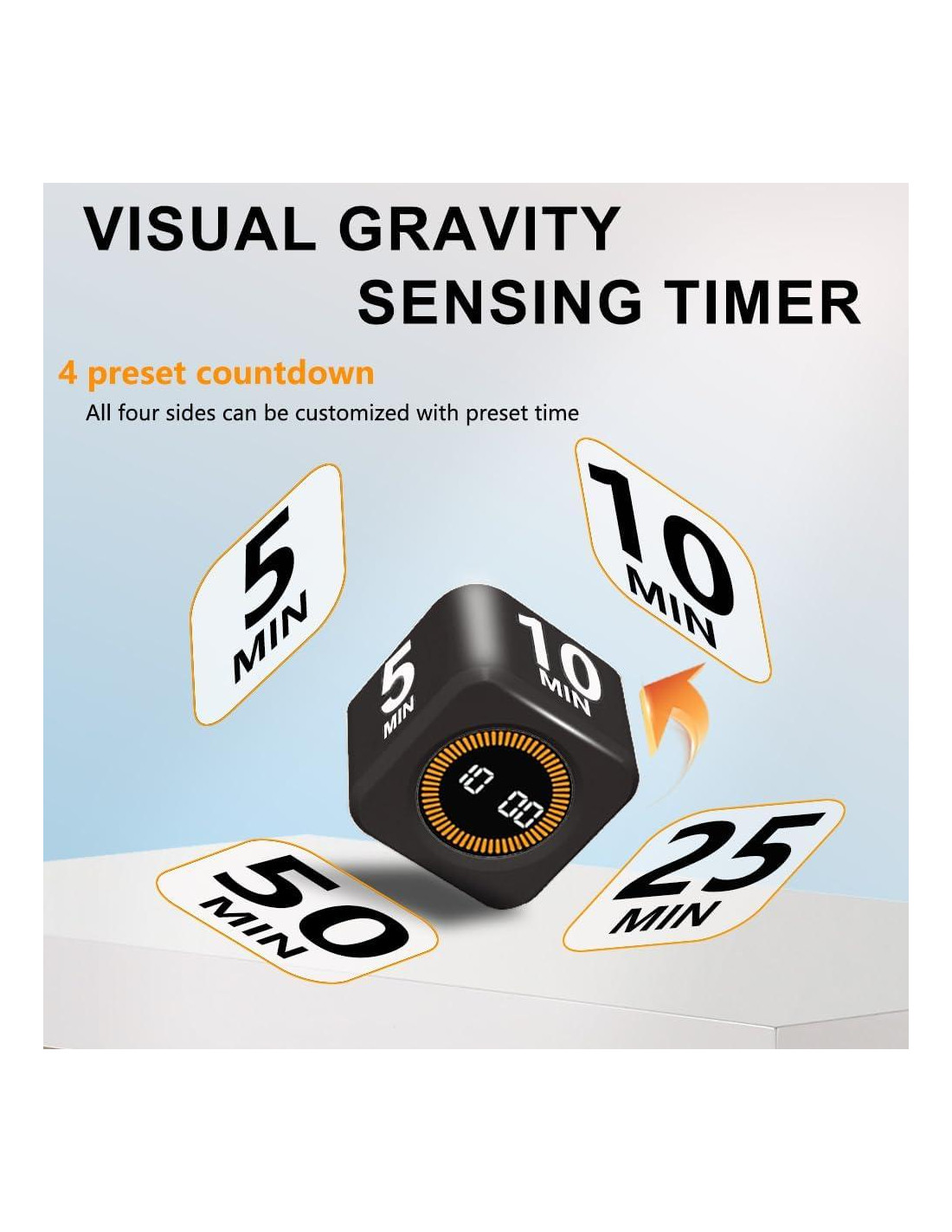 - Temporizador Sensor Rotativo --- Este temporizador de cubo sensorial ofrece una experiencia fácil de usar con 4 tiempos de cuenta regresiva preestablecidos (5/10/25/50 minutos). Voltea el temporizador al número preestablecido con la cara hacia arriba, y luego comenzará automáticamente la cuenta regresiva. Voltea la pantalla del temporizador hacia arriba para detener el tiempo. Voltea la pantalla del temporizador hacia abajo, luego restablece a cero con los botones de configuración en la parte posterior.