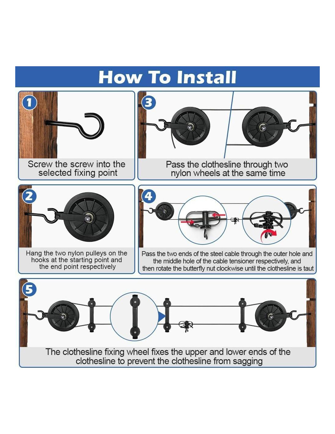 - Kit completo para un secado sin complicaciones: este kit completo de polea de tendedero cuenta con un cable de acero recubierto de vinilo negro de 150 pies, 2 poleas de nylon (6.3"), 2 ganchos M8, 3 separadores de tendedero y 1 mini cabrestante de metal; todo lo que necesita para un secado de ropa eficiente y sin complicaciones, en interiores o exteriores.