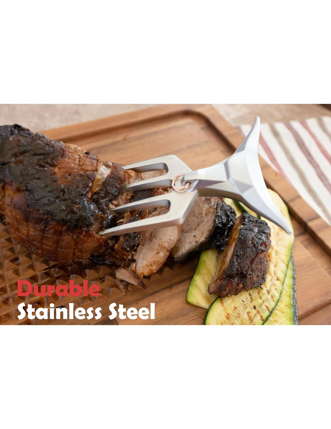 - TALLA: Ya sea brisket, asados, solomillo, pollo, pavo o cerdo, este tenedor de carne de metal es la herramienta perfecta para tallar expertamente un gran trozo de carne. Los cuatro dientes del tenedor mantienen la carne estable y en su lugar mientras tallas. El mango de toro se ajusta cómodamente en tu mano para ayudar a evitar calambres y deslizamientos.