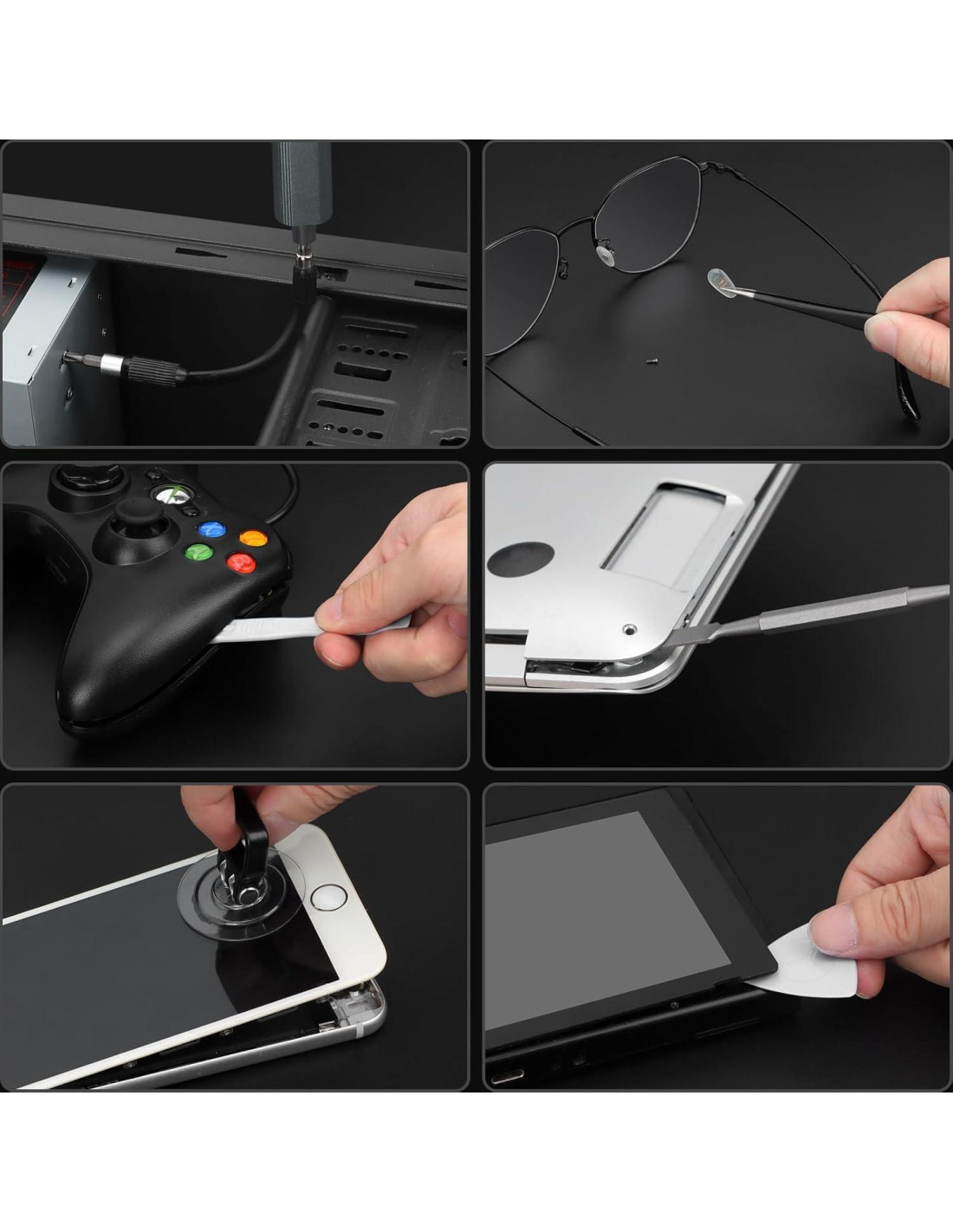 - Componentes incluidos: 1 X Destornillador Eléctrico, 136 Puntas de Precisión de Acero S2, 1 X Espátula de Metal, 1 X Pinzas Puntiagudas, 1 X Espátula de Gancho de Nylon, 1 X Herramienta de Palanca, 1 X Herramienta Desmagnetizadora, 1 X Destornillador de 4mm, 1 X Eje de Extensión Flexible, 4 X Puntas de Apertura, 1 X Ventosa, 4 X Puntas Largas, 1 X Alfombrilla Magnética, 1 X Cable de Carga USB, Estuche de Almacenamiento, Estuche, Puntas de Destornillador