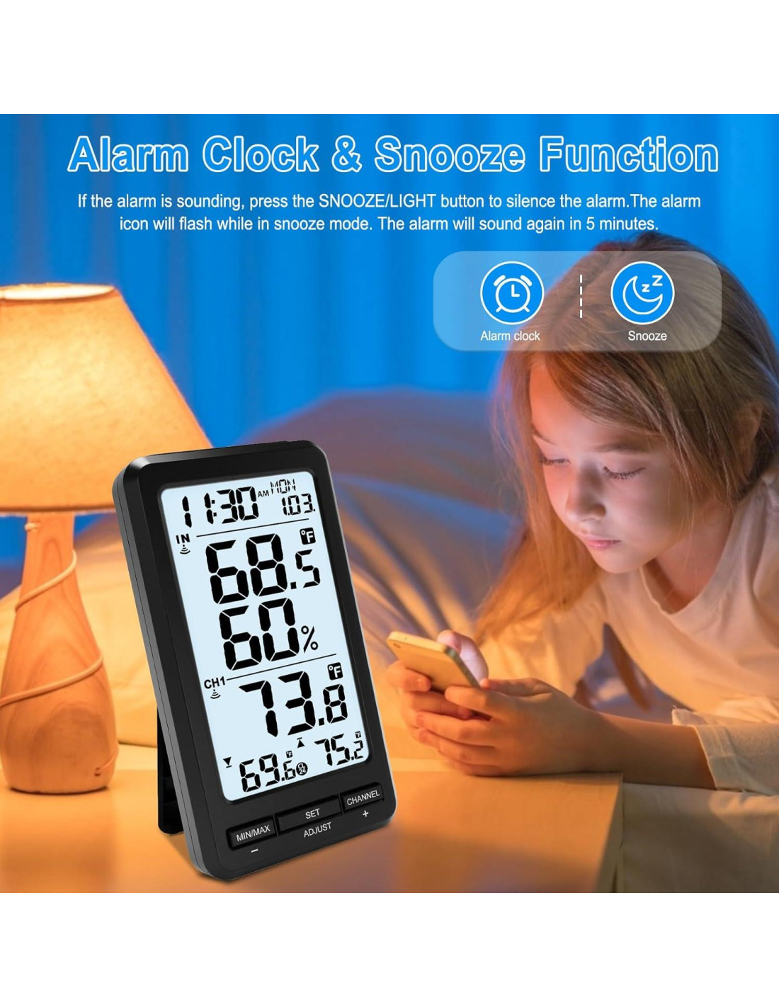 - Termómetro de Piscina Multifuncional Este termómetro de piscina con función de memoria puede registrar la temperatura mínima/máxima, humedad, temperatura interior/piscina (cambio opcional C/F) y función de repetición. Este termómetro de piscina puede configurar alarma de reloj, también puede configurar alarma de temperatura del agua Alta/Baja