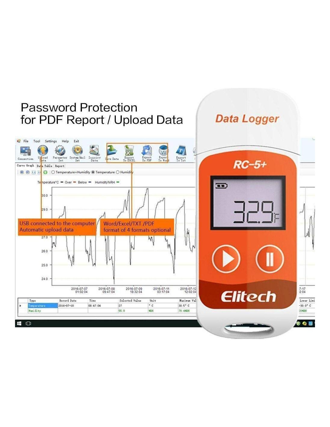 - Características: Registrador de datos de temperatura multiuso con amplio rango de medición | Versión mejorada del RC-5 con nuevas funciones de informe PDF automático | Reiniciar el registrador presionando un botón | Puerto USB incorporado, sin cable, sin lector, sin software requerido para descargar datos