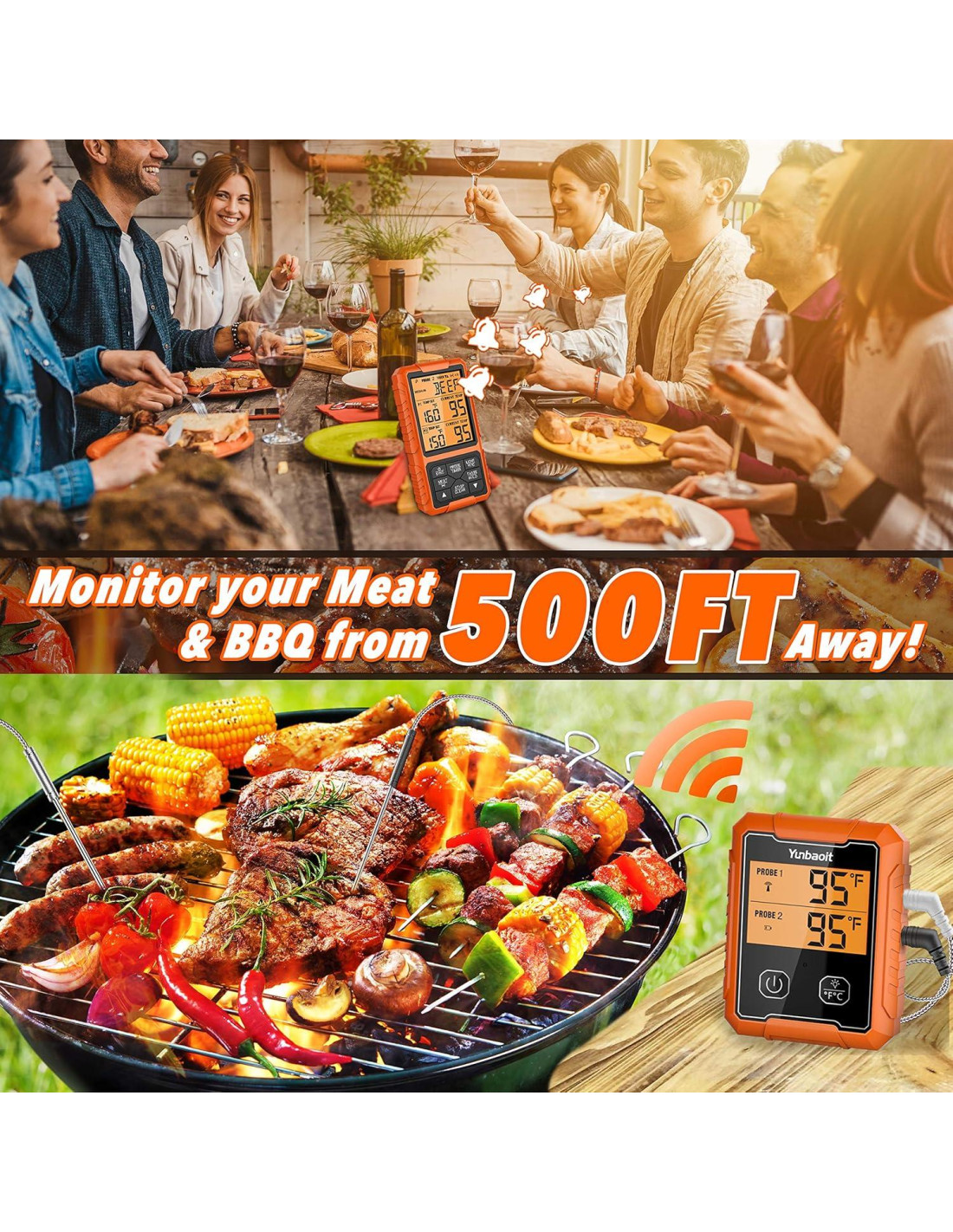 - Sondas de doble color lavables: Las 2 sondas de termómetro de carne de diferentes colores te ayudan a identificar qué carne estás monitoreando. Las sondas y el cable son impermeables, lo que te permite ponerlas en el lavavajillas o enjuagarlas directamente con agua