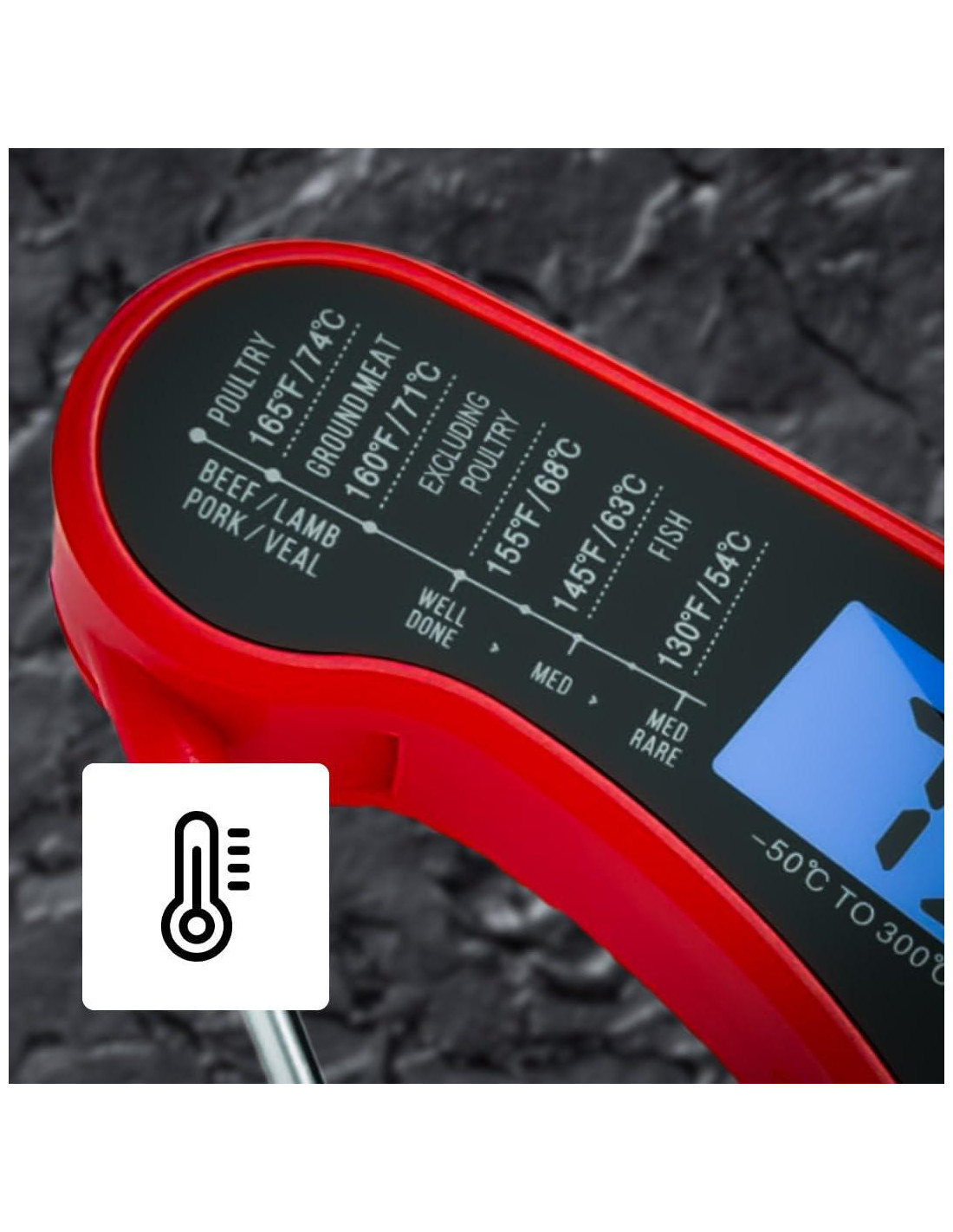 - Pantalla Retroiluminada de Alto Contraste: Equipado con una gran pantalla retroiluminada LED de alto contraste, este termómetro de lectura instantánea es ideal para condiciones de cocción con poca luz. Ya sea en la cocina o al aire libre, este diseño digital de termómetro de carne es perfecto para usuarios diestros y zurdos.