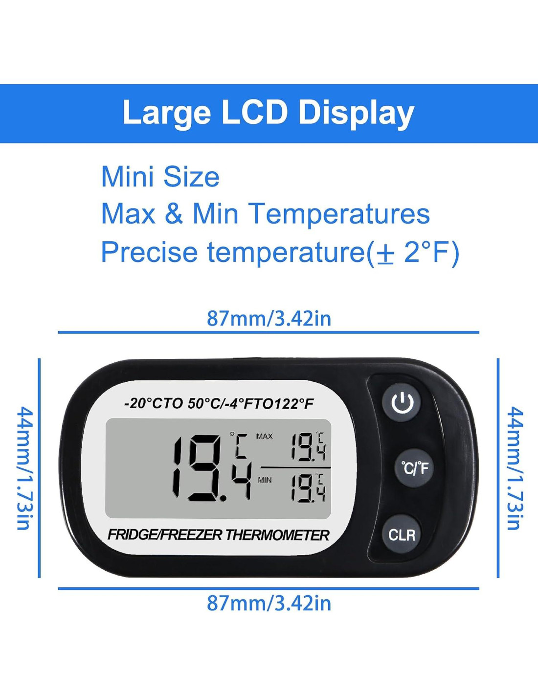 - Los termómetros digitales de refrigerador tienen una gran pantalla LCD electrónica, la información en la pantalla muestra la temperatura máxima, mínima y actual al mismo tiempo. (Consejos: Por favor, retire la película protectora de la superficie de la pantalla antes de usar)
