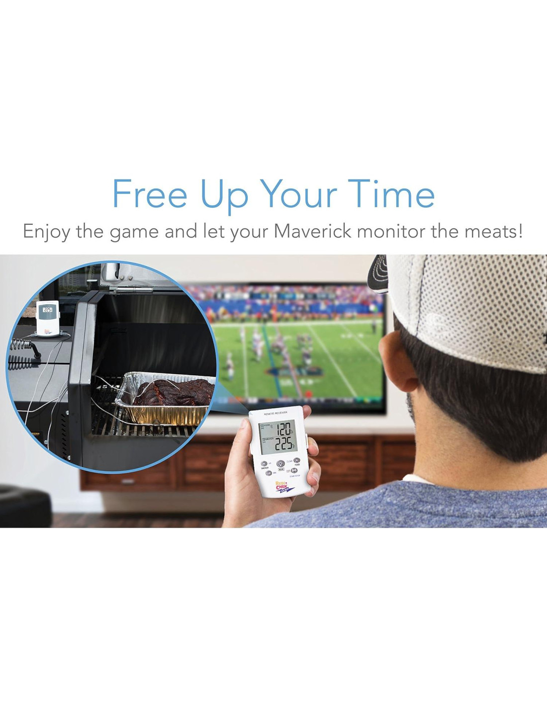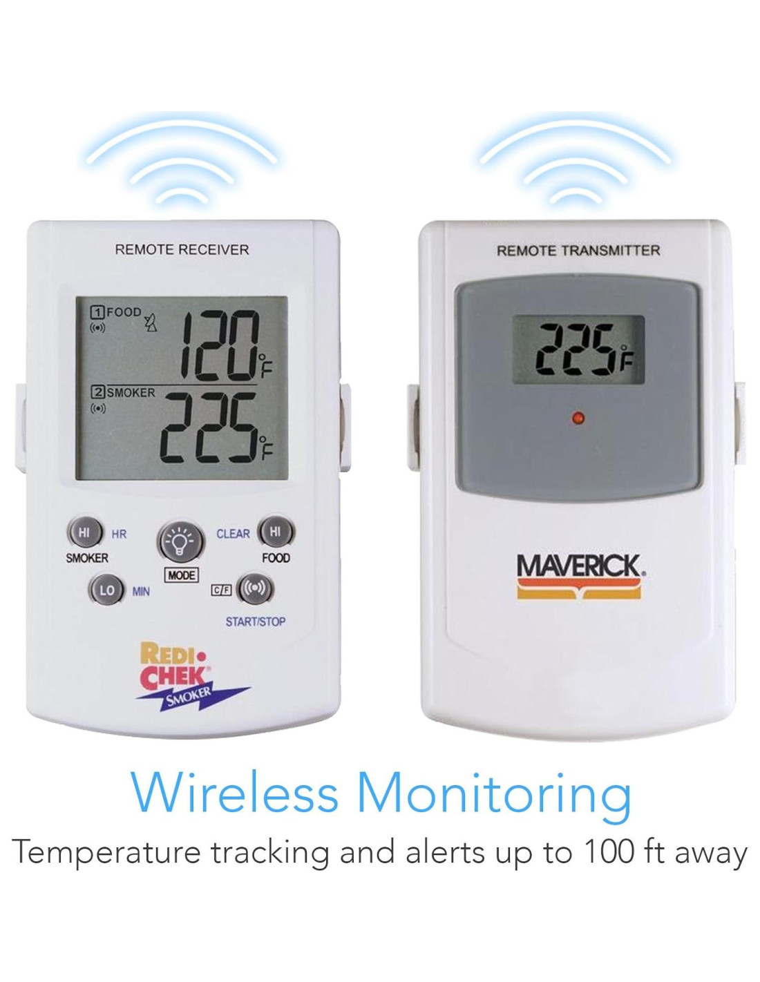- Monitorea las temperaturas del ahumador/carne desde 100 pies (30,48 m) de distancia
