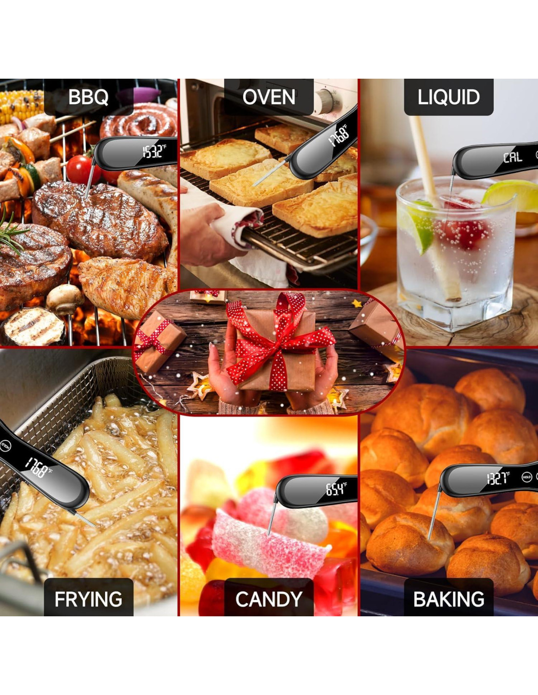 - Nuestros termómetros digitales de carne son perfectos para carne, líquidos, frituras y hacer caramelos. Adecuados para freidoras de aire, hornos, parrillas, barbacoas, máquinas de ahumar, cocinas y al aire libre. Los imanes internos resistentes y los grandes agujeros para colgar se pueden conectar a refrigeradores/hornos/ganchos para un fácil almacenamiento.