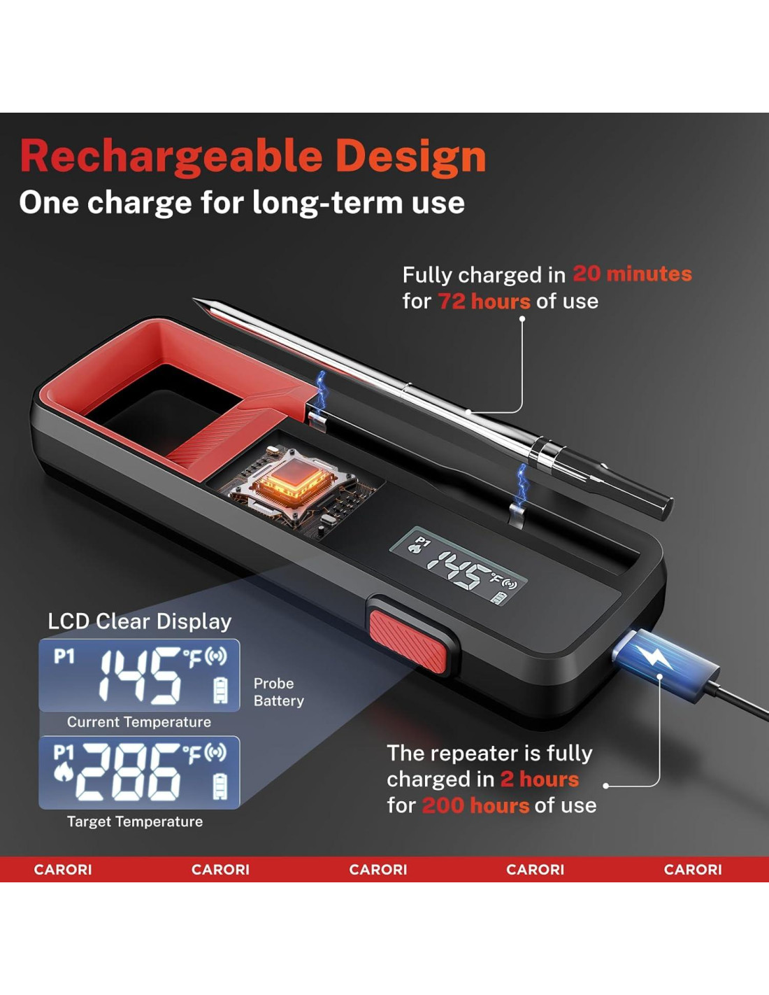 - App Gratuita: Conecta tu Sonda de Termómetro de Carne CARORI a la app gratuita ToGrill, disponible en iOS (versión 11.0 o posterior) y Android (versión 5.0 o posterior).