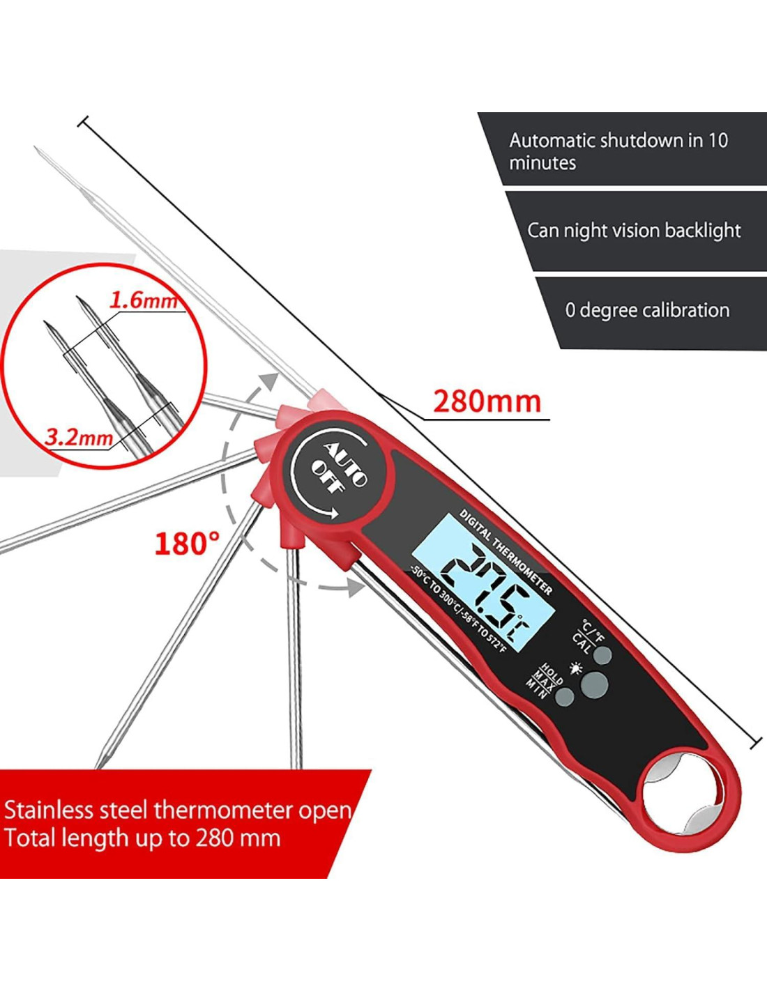 - [Función Inteligente de Apagado/Encendido Automático] - Termómetro digital de alimentos para cocinar que ahorra energía, despliega la sonda para encender, pliega para apagar y se apagará automáticamente en 10 minutos si olvidas plegar la sonda.