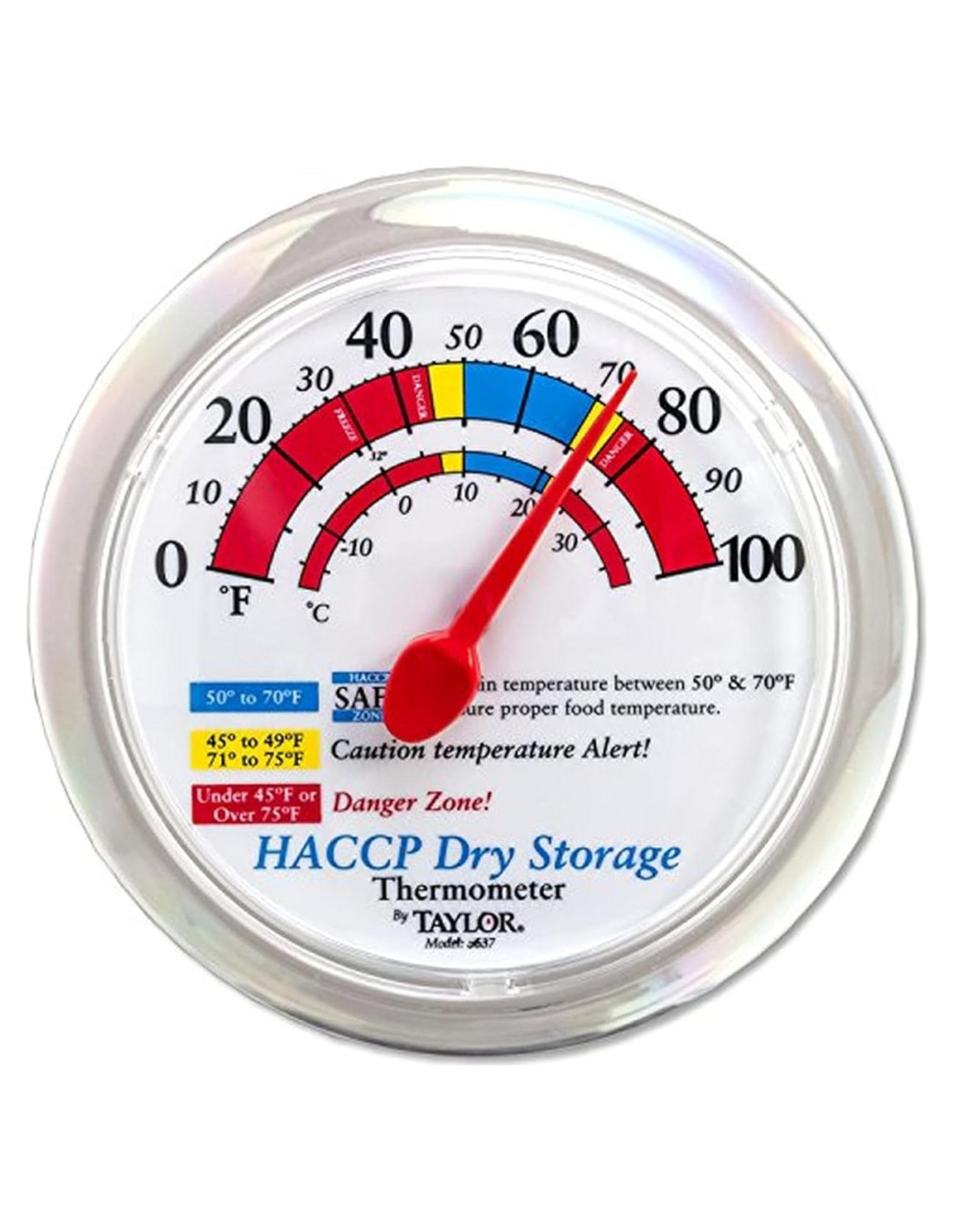 Montar este termómetro de almacenamiento seco audaz y vibrante con un dial de 6 pulgadas (15.24 cm) en la pared de su cocina para una referencia de temperatura inconfundible. Los gráficos están serigrafiados en el bisel transparente. Los números fáciles de leer están aumentados con zonas de temperatura codificadas por color para la temperatura adecuada para los alimentos de almacenamiento seco. Los termómetros Taylor son el estándar de oro científico para la precisión en las cocinas comerciales.