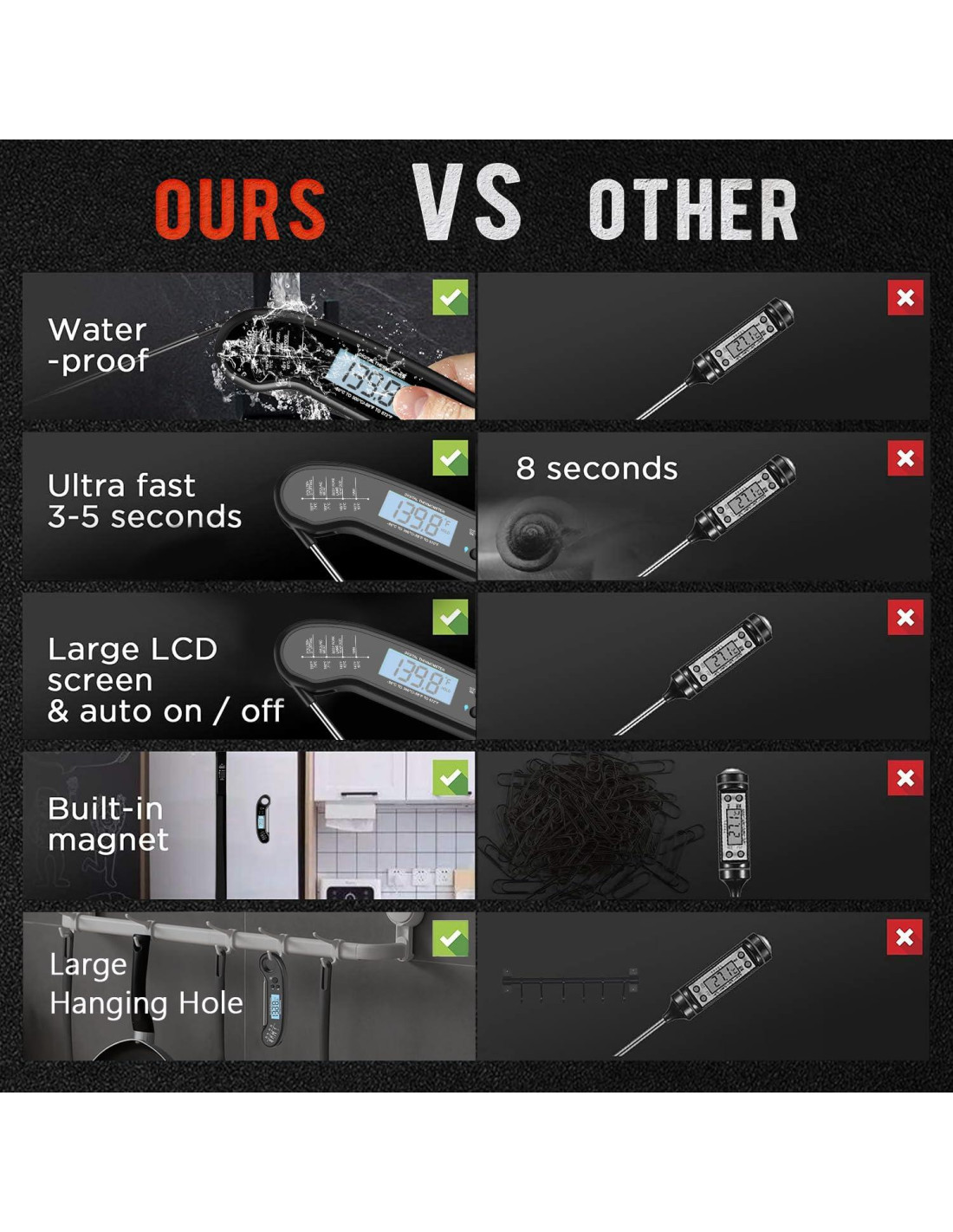 - Un gadget imprescindible para BBQ al aire libre - Pantalla LCD grande para lectura instantánea, el diseño retroiluminado puede ayudarte a leer claramente incluso en la oscura noche de BBQ al aire libre o en el denso ambiente de parrilla humeante. El fuerte imán interno y el gran agujero para colgar pueden ser fijados al refrigerador/horno/ganchos para un almacenamiento práctico
