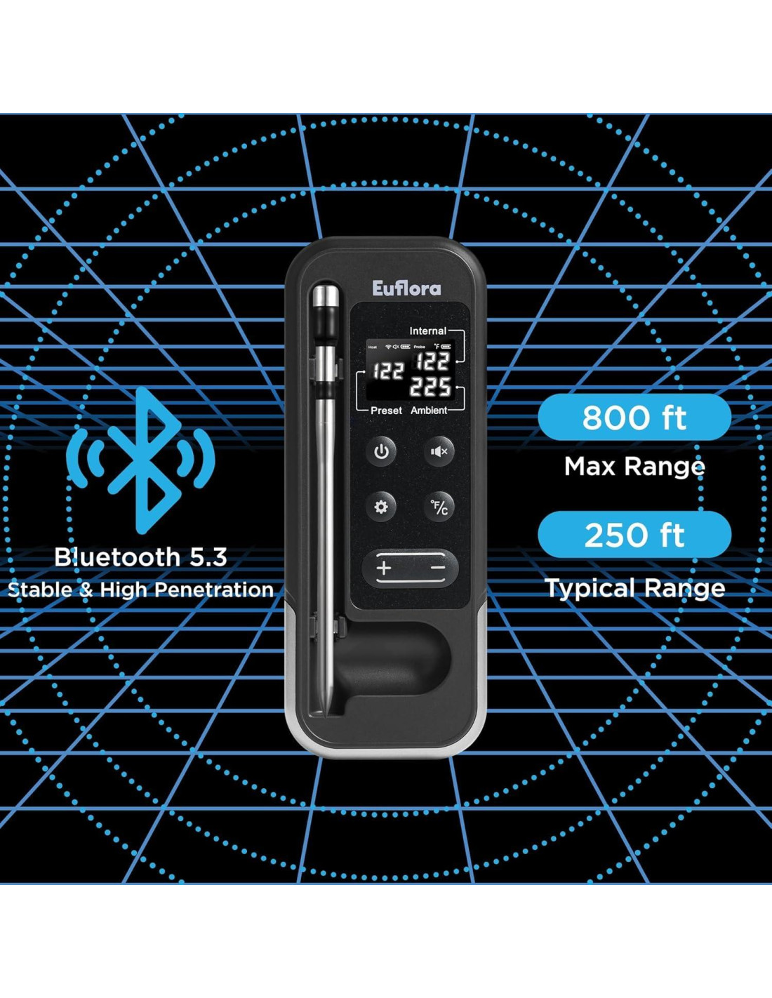 - RANGO AMPLIADO: Mantiene una conexión inalámbrica estable hasta 800 pies (243.84 metros) de distancia, permitiéndote monitorear tu cocción desde cualquier lugar de tu hogar