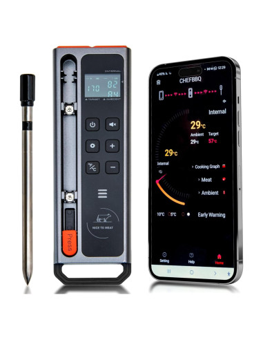 - Componentes incluidos: Termómetro Digital de Carne con Sonda de Temperatura, Conectividad con Aplicación para Smartphone