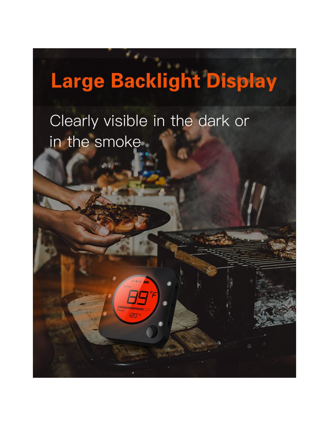 - Pantalla LCD Grande: La pantalla LCD grande del termómetro para ahumador y la visualización de números pueden liberar la fatiga visual. Puedes leer mucha información en la pantalla: Señal de Conexión, Indicador de Potencia, Temperatura Actual, Temperatura Objetivo, Indicador de Progreso, etc. La función de retroiluminación asegura una visualización clara en la oscuridad o en humo. La pantalla del termómetro bluetooth mostrará cíclicamente las temperaturas de cada probeta por turno.