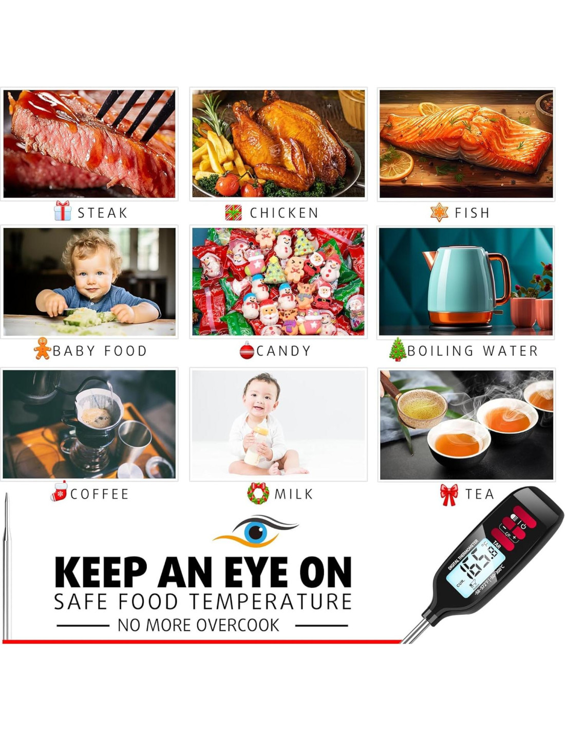 - [ Respuesta Rápida y Precisa ] Este termómetro digital de lectura instantánea para carne verifica instantáneamente las temperaturas de bistec, pollo, pescado, leche, jarabe de caramelo, pan o aceite de fritura en 2 segundos. Nunca más sobrecocines carnes o quemes postres.