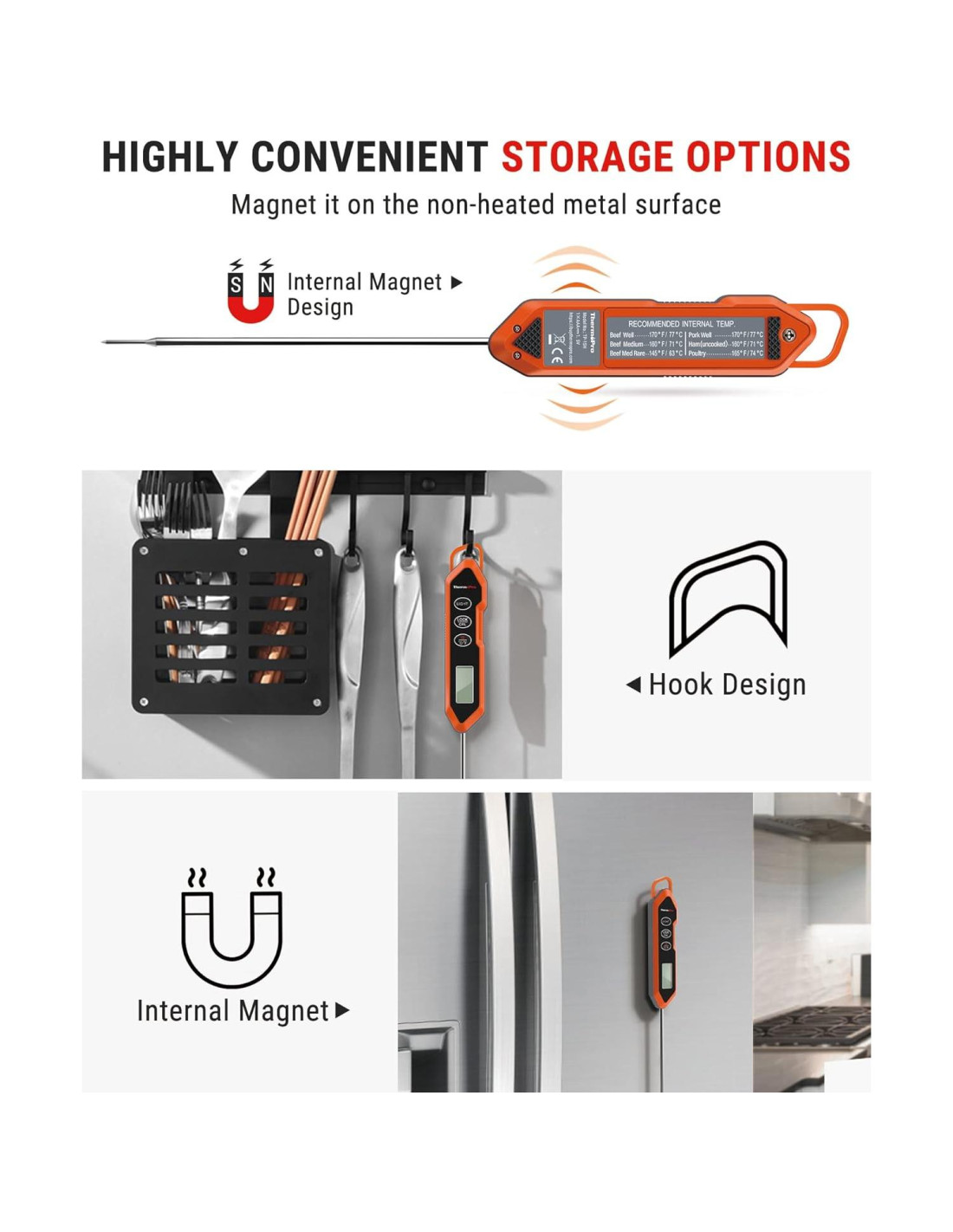 - Almacenamiento conveniente: El termómetro digital para cocinar cuenta con un respaldo magnético para permitir su colocación en el costado de una BBQ o usar el agujero para colgar en ganchos