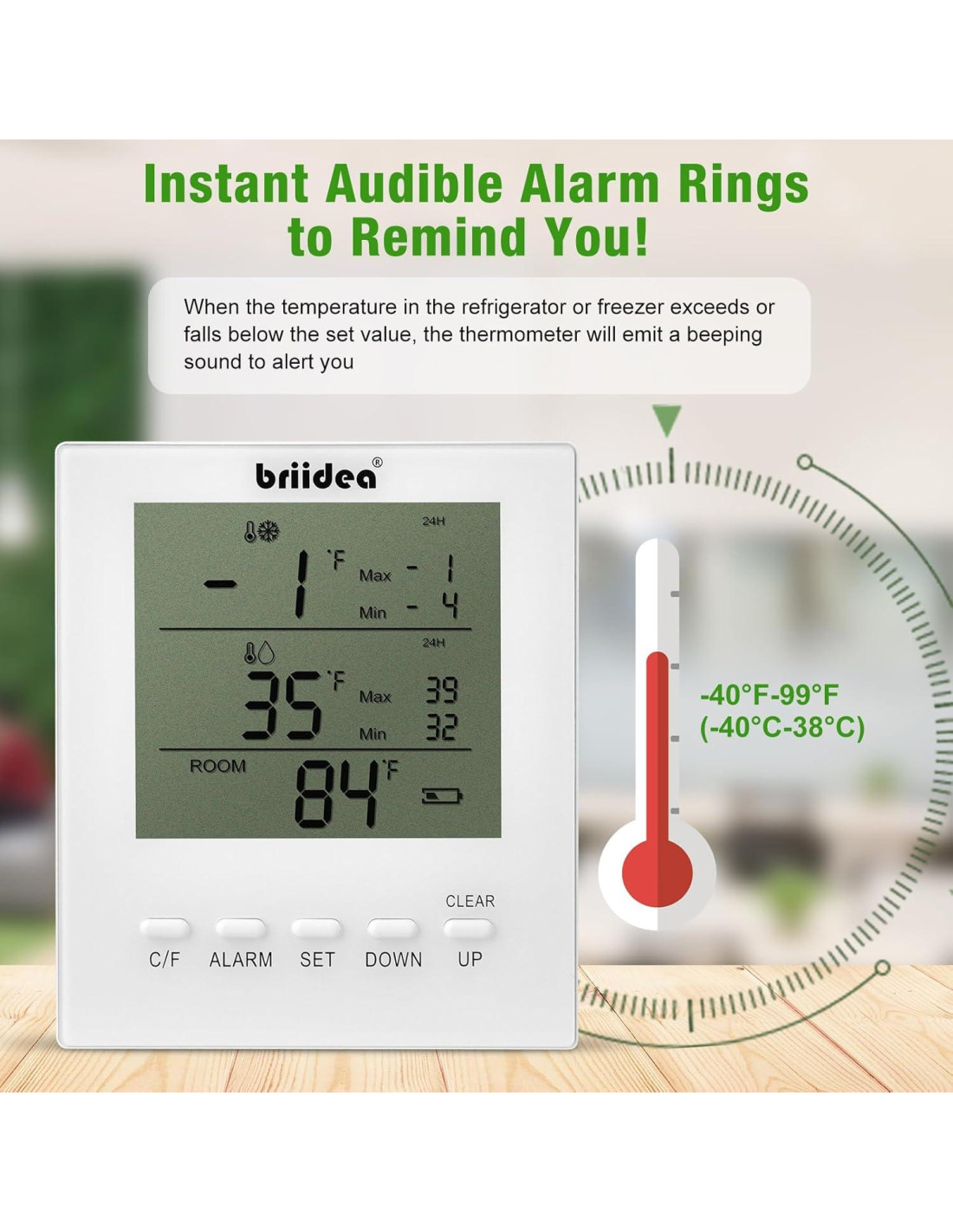 - SEGURIDAD ALIMENTARIA: Asegurar una temperatura constante tanto en el refrigerador como en el congelador es vital para la seguridad alimentaria. El termómetro para refrigerador y congelador Briidea te notificará sobre cualquier irregularidad de temperatura resultante de cortes de energía repentinos, problemas de refrigeración o factores como dejar la puerta del refrigerador abierta. Esto asegura que puedas tomar medidas necesarias de inmediato para prevenir el deterioro de alimentos, protegiendo la salud de ti y tu familia