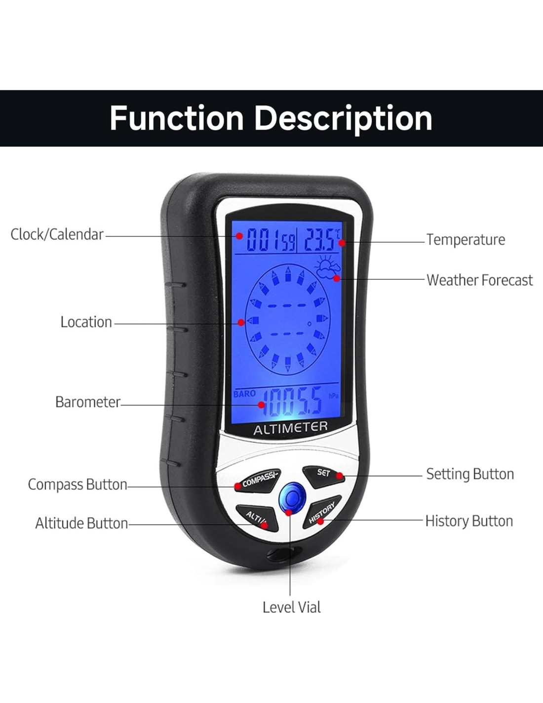 - Instrumento Multifuncional 8 en 1: Este dispositivo altímetro digital 8 en 1 sirve como altímetro, barómetro, brújula electrónica y herramienta digital multifuncional, proporcionando temperatura, hora y actualizaciones meteorológicas y cuenta con una retroiluminación electrónica de 5 segundos.
