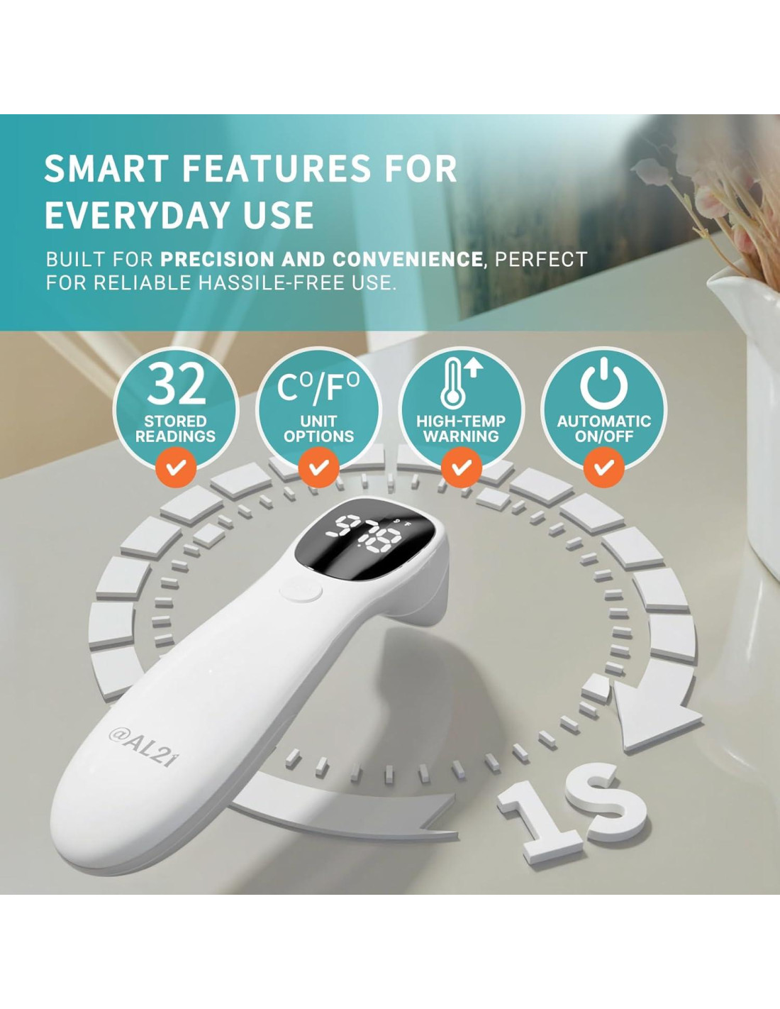 - TERMÓMETRO DE DUAL-MODO RÁPIDO Y PRECISO: El Termómetro Infrarrojo AL21 cuenta con modos de frente y oído, cambiando sin esfuerzo con una simple extracción de la tapa. Diseñado para lecturas rápidas y confiables, asegura precisión para todas las edades: bebés, niños y adultos.