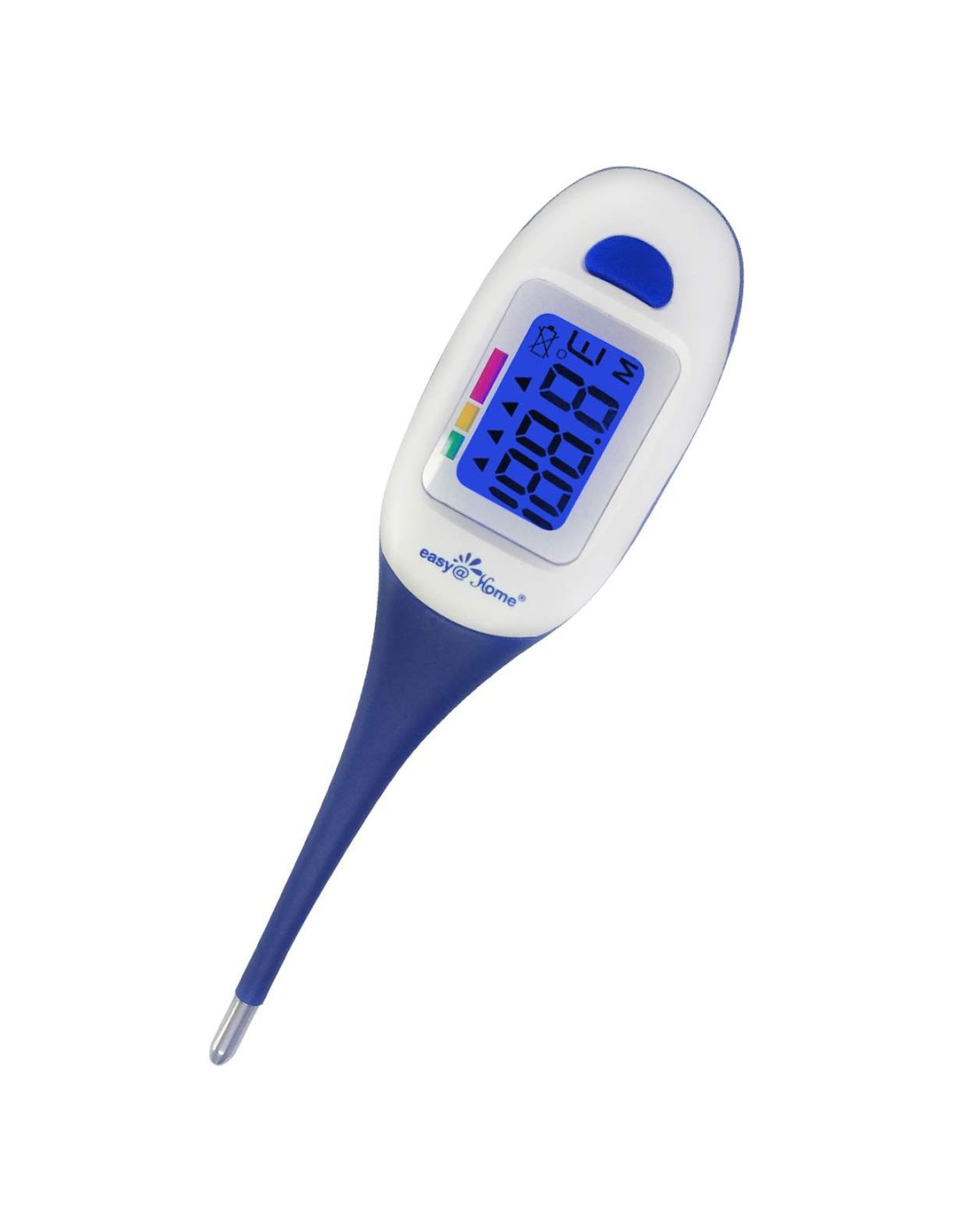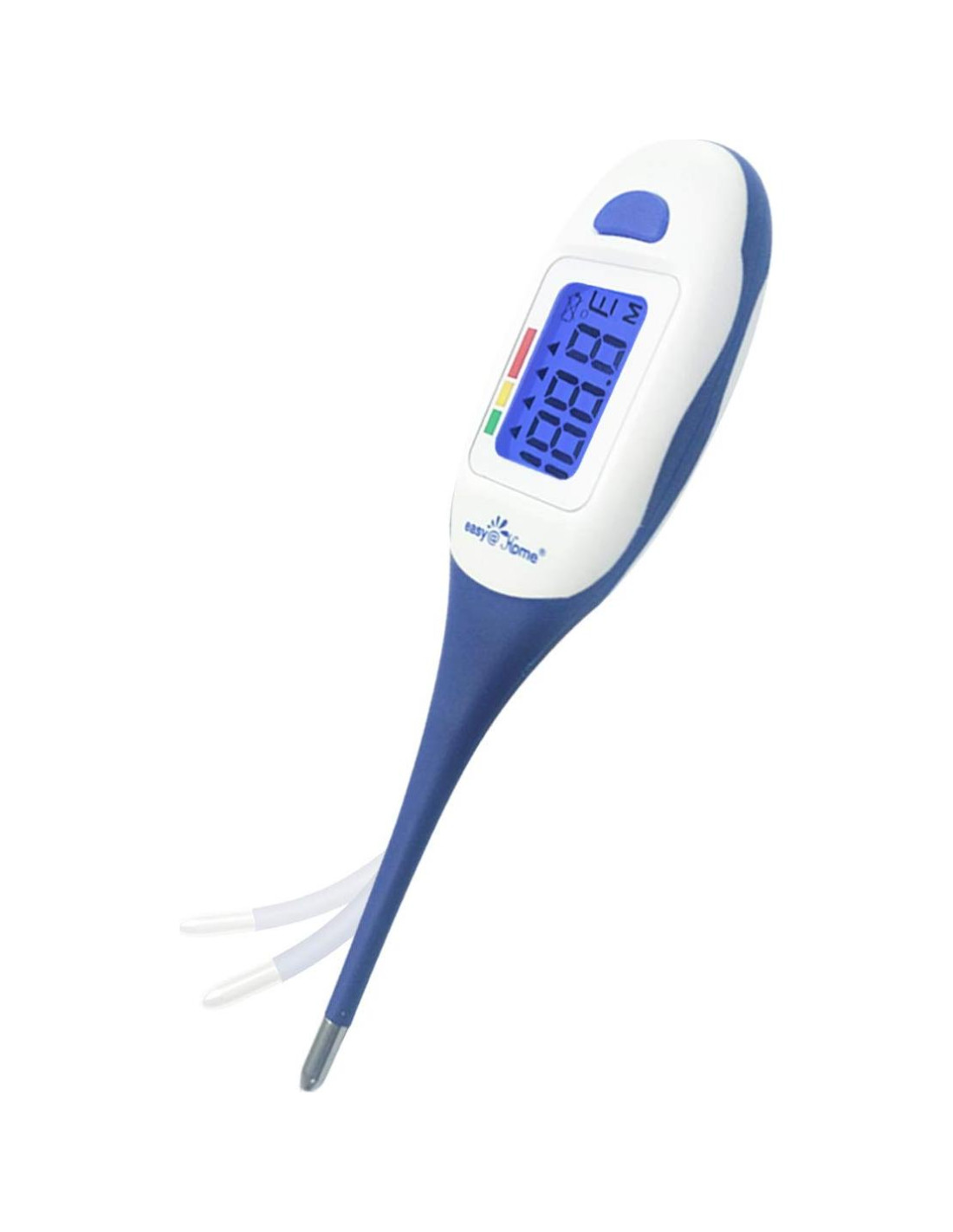En Easy@Home, nuestra misión es mejorar y simplificar las soluciones de atención médica, llevándolas directamente a su puerta. Empodérese con nuestros productos intuitivos y tecnología innovadora, que permiten una gestión fluida de su bienestar desde la comodidad de su hogar. Experimente las soluciones de atención médica sin esfuerzo y convenientes que Easy@Home hace posible. Cambie fácilmente las unidades entre Celsius y Fahrenheit manteniendo presionado el botón ON/OFF durante 3 segundos. Elija una unidad según su preferencia y cámbiela libremente. La punta flexible y suave se puede usar fácilmente debajo de la lengua, en la axila o rectalmente sin dañar su piel. Este termómetro digital utiliza una batería CR2032 de 3V. Cuando la batería se agota, solo necesita girar la tapa trasera detrás del termómetro hacia la izquierda para abrirla fácilmente. (Consejo: cuando el termómetro está abierto, el ícono con poca energía de la batería se mostrará normalmente, y cuando la batería está muerta, el ícono de rayo aparecerá en el ícono de la batería). Este termómetro digital está equipado con Tecnología de Indicación de Fiebre para identificar instantáneamente y fácilmente cuando hay fiebre presente. Al finalizar cada medición, la flecha triangular en la pantalla indicará si el usuario no tiene fiebre (Verde), fiebre leve (Amarillo), fiebre media (Parte izquierda de Rojo) o fiebre alta (Parte derecha de Rojo). La ventana de visualización digital precisa es fácil de leer con una Pantalla LED Grande, y solo toma 15 segundos obtener una lectura de temperatura para medición oral. El termómetro tiene función de memoria, que puede mostrar las últimas 10 mediciones después de que el dispositivo se enciende, por lo que puede rastrear fácilmente el progreso de la fiebre y es conveniente comparar la temperatura corporal antes y después. Uso Oral: Coloque el termómetro debajo de la lengua. Cierre la boca y respire regularmente por la nariz para evitar que la medición se vea influenciada por el aire inhalado/exhalado. La temperatura normal está entre 96.3F y 99.1F (35.7C y 37.3C). Atención: No coma ni beba antes de la medición. Uso Axilar: Seque la axila. Coloque la sonda en la axila y mantenga el brazo presionado firmemente al costado. Este método puede proporcionar lecturas inexactas debido a la posibilidad de imprecisión y no se recomienda cuando se requieren mediciones precisas. La temperatura normal para una lectura auxiliar está entre 95.4F y 98.1F (35.2C y 36.7C). Uso Rectal: Lubrique la punta de la sonda metálica con vaselina para facilitar la inserción. Inserte suavemente el sensor aproximadamente 1cm (menos de 1/2") en el recto. La temperatura normal está entre 97.2F y 99.9F (36.2C y 37.7C).