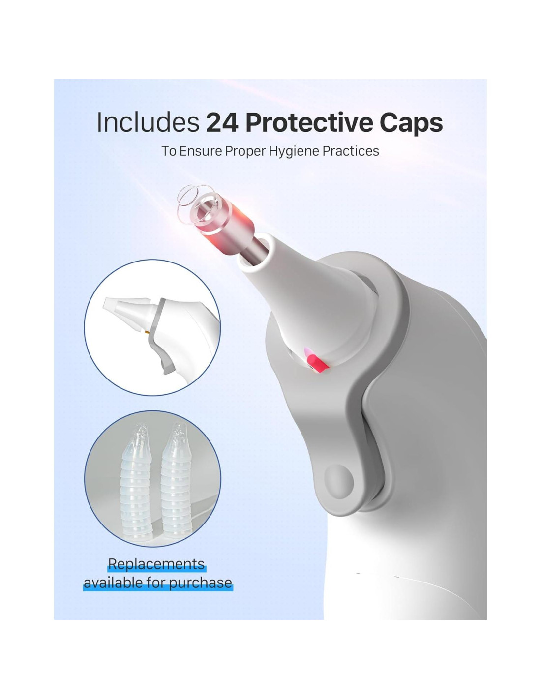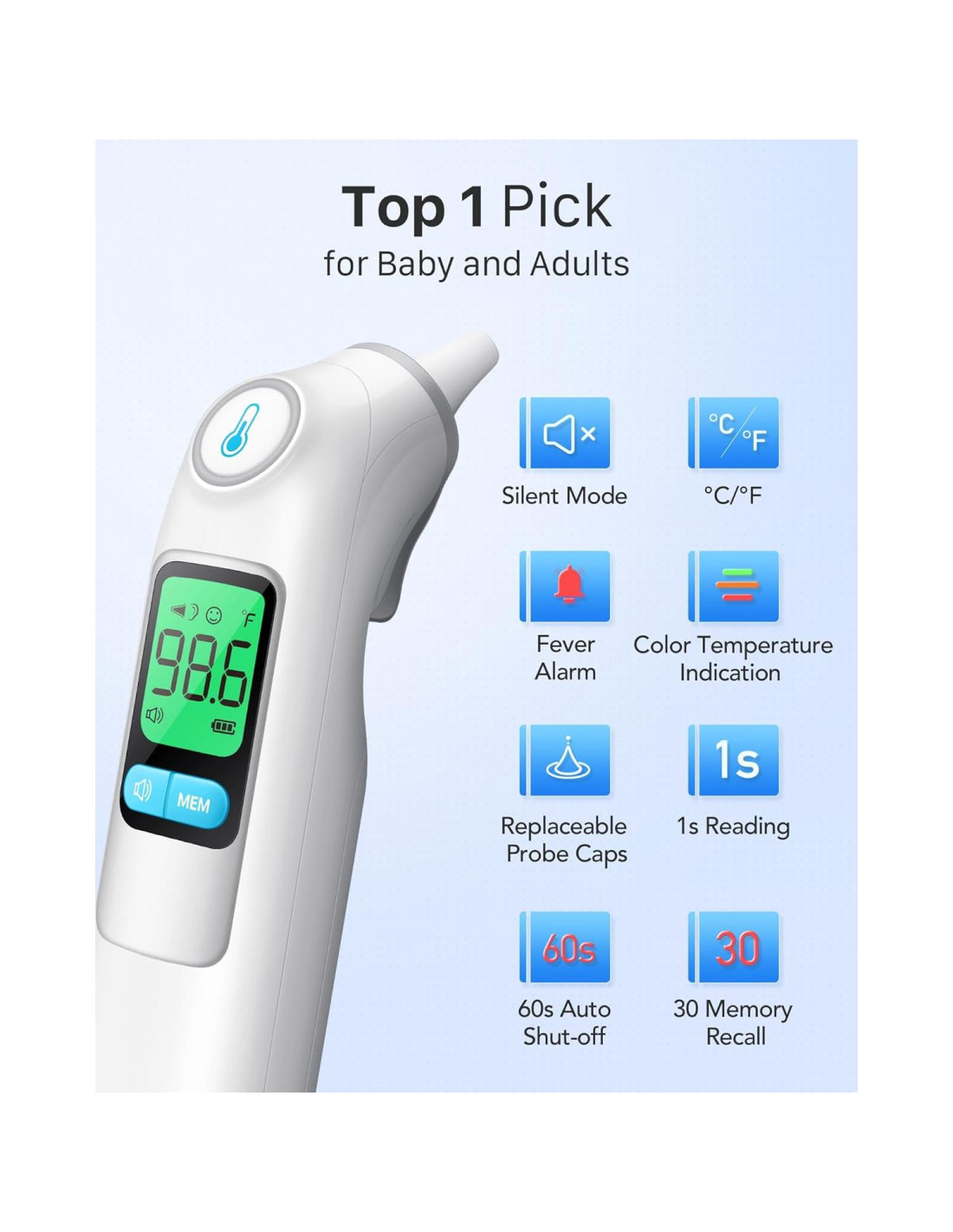 - SIN CONTACTO Y MÁS HIGIÉNICO: Sin contacto con la sonda durante la medición de temperatura, 24 cubiertas de oído desechables reemplazables integradas, reemplace las cubiertas de oído antes de cada medición de temperatura para prevenir infecciones mutuas entre los miembros de la familia