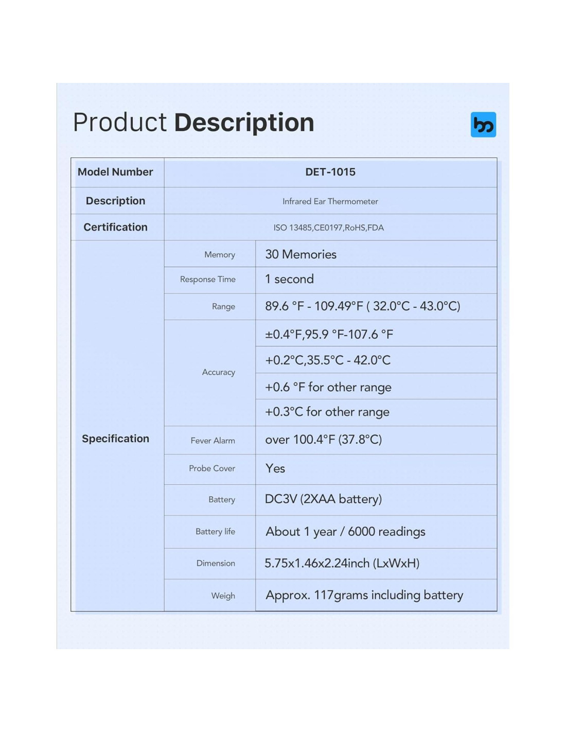 - RESULTADOS PRECISOS Y OPERACIÓN SIMPLE: Chip SOC integrado, además de algoritmo de compensación de temperatura por anillo infrarrojo, para que los resultados de la medición no se vean afectados por el entorno, solo presione el botón de medición de temperatura en el canal auditivo para obtener el grado, pasó múltiples verificaciones clínicas, es un termómetro digital de oído de alta precisión confiable