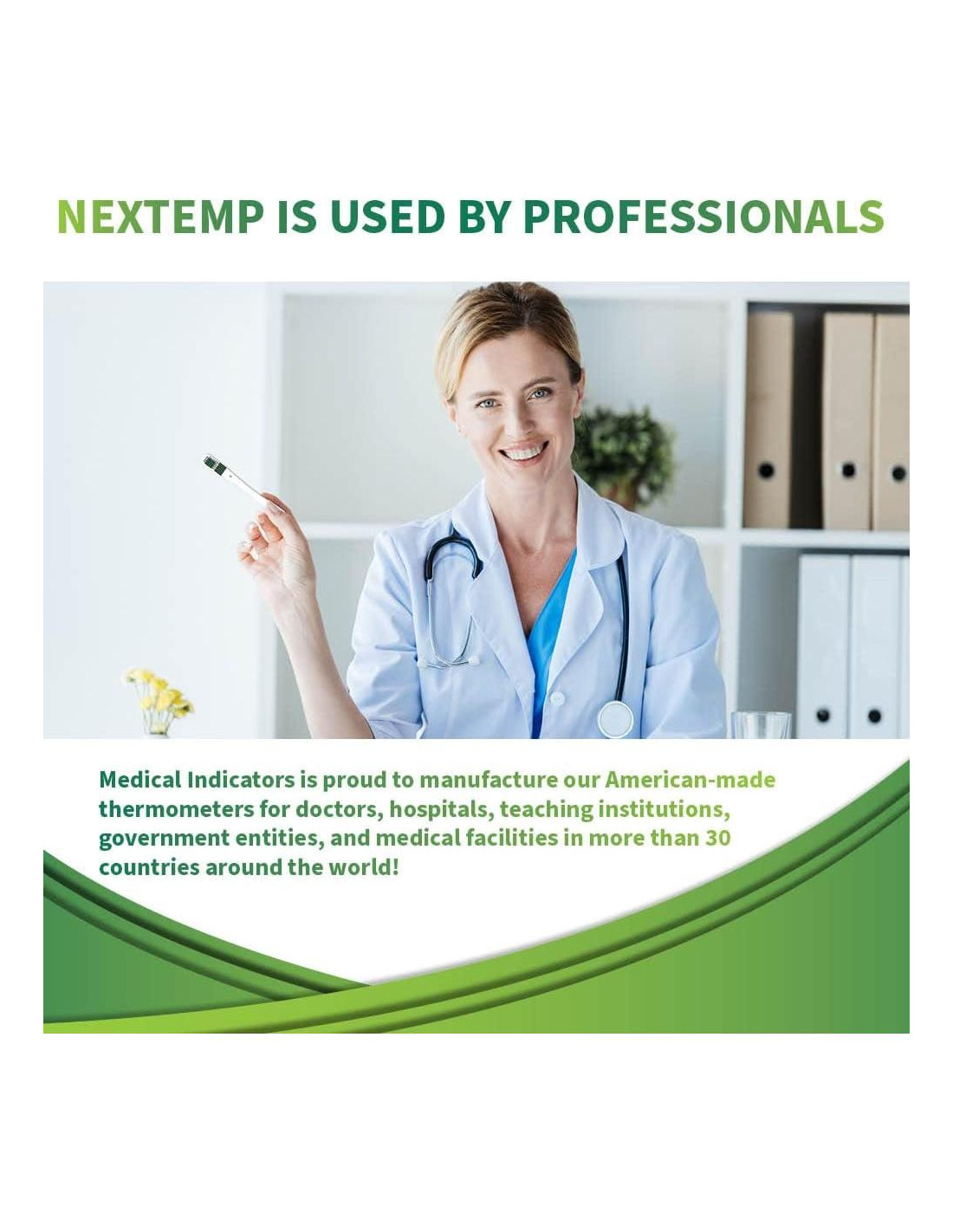 Los termómetros de un solo uso NexTemp eliminan prácticamente el riesgo de propagar enfermedades al proporcionar un instrumento limpio que se utiliza una vez y luego se desecha. Y, la precisión inigualable de los termómetros NexTemp brinda tranquilidad, sabiendo que tiene la mejor atención posible para usted y sus seres queridos. Medical Indicators ha estado fabricando con orgullo termómetros NexTemp en los EE. UU. durante más de 30 años. Los termómetros NexTemp utilizan una innovación notable conocida como Tecnología de Cristales Líquidos NexTemp. Los cristales líquidos sensibles al calor miden y muestran la temperatura corporal, ofreciendo una precisión y fiabilidad inigualables. Disponibles en Fahrenheit y Celsius, los termómetros NexTemp son precisos a +/-0.2F (+/-0.1C). Medical Indicators se enorgullece de fabricar nuestros termómetros de fabricación estadounidense para médicos, hospitales, instituciones educativas, entidades gubernamentales y centros médicos de todo el mundo. ¡Y ahora estamos orgullosos de ofrecer el mismo nivel de seguridad y protección para individuos y familias también!