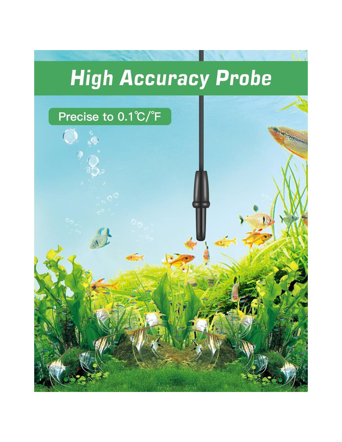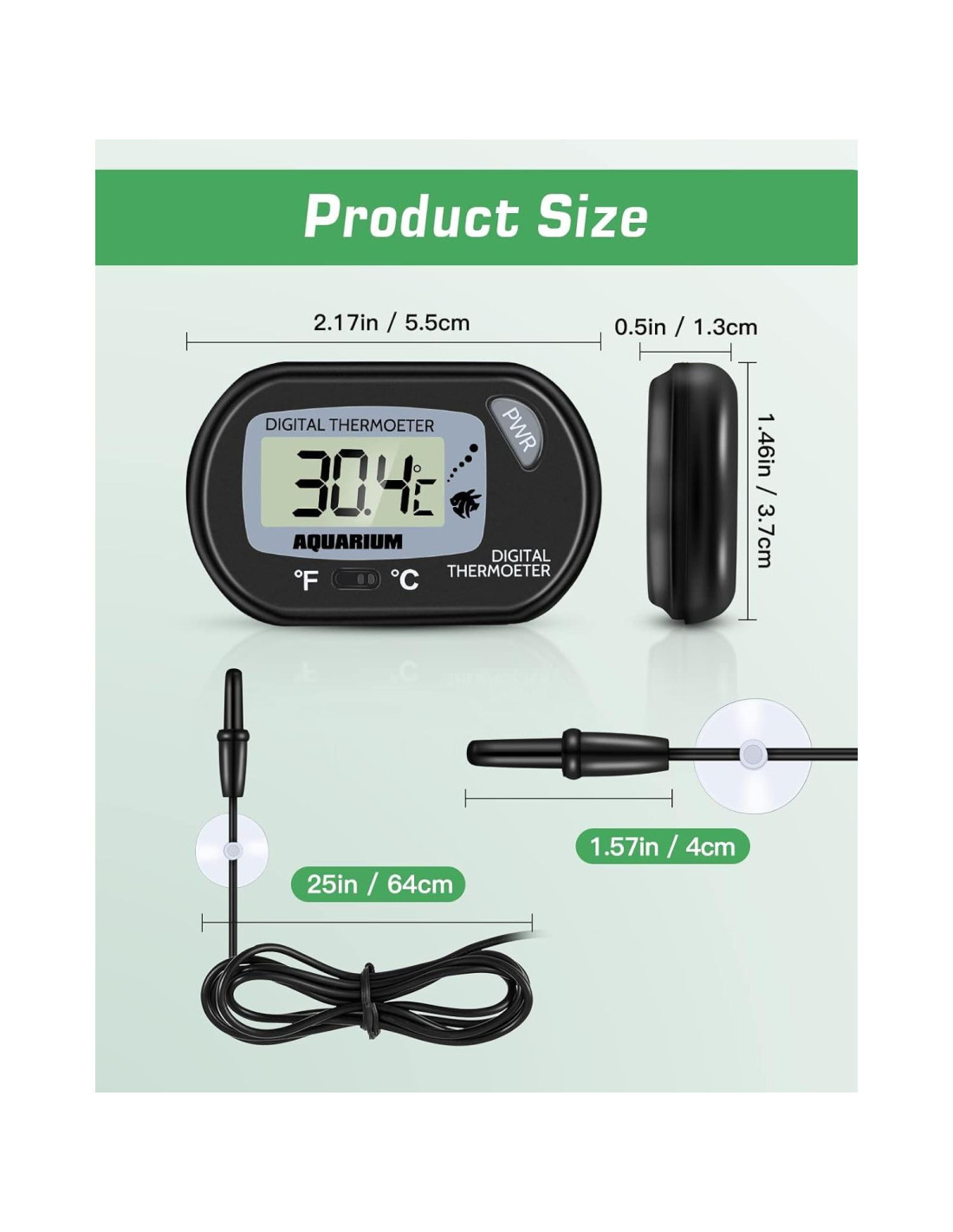 Nuestro termómetro digital cuenta con una pantalla digital fácil de leer con temperatura en Fahrenheit o Celsius según tu elección. El termómetro es lo suficientemente preciso como para crear lecturas dentro de 1 grado. ¿Buscas un termómetro para tu pecera? ¡Nuestro termómetro digital es una buena opción para ti! 1. Coloca la unidad de visualización en el exterior del tanque usando las ventosas y sumerge la sonda en el agua del tanque. 2. Presiona y mantén presionado el botón de encendido (PWR) para encender. Mantén presionado el botón de encendido durante 3 segundos para apagar.