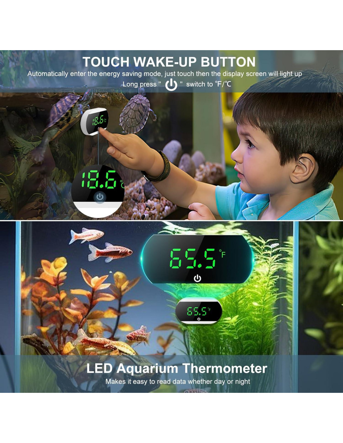 - Control Táctil: Con un interruptor sensible al tacto, el termómetro digital para acuarios proporciona monitoreo de temperatura en tiempo real cuando se activa y activa automáticamente el modo de suspensión después de 10 segundos de inactividad. Cambie fácilmente entre lecturas en Celsius y Fahrenheit con una larga presión en el botón de encendido.