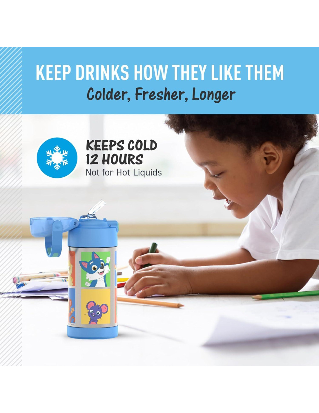 La botella de agua de acero inoxidable aislada al vacío FUNtainer de 12 oz con pajilla mantiene las bebidas frías hasta por 12 horas. Nuestras botellas de agua para niños están diseñadas para que sus bebidas estén tan frías por dentro como se ven por fuera. Los niños se mantienen hidratados y los padres felices. La construcción de acero inoxidable de doble pared está diseñada para soportar caídas, golpes y diversas travesuras. Incluye un asa de transporte integrada con un agarre suave, lo que facilita a los niños llevarla consigo durante todo el día. Incluye una pajilla de silicona cubierta higiénicamente que es removible para una fácil limpieza. Para limpiar, puedes poner tu botella de agua FUNtainer en el lavavajillas; sin embargo, se recomienda lavar a mano. No es apta para líquidos calientes.