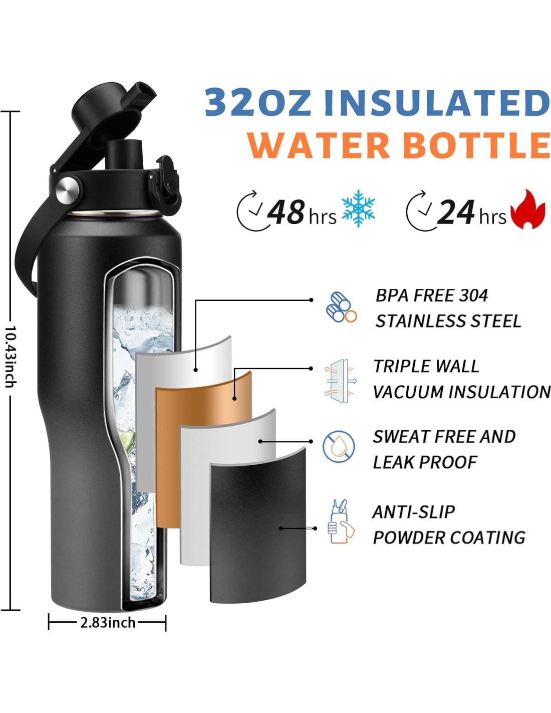 - MANTIENE FRÍO-24H CALIENTE-24H: Los termos de 32 oz (0,95 L) con aislamiento al vacío cuentan con doble pared de acero inoxidable de grado alimenticio 18/8, que aseguran que esta taza de agua metálica mantenga los líquidos fríos hasta por 48h y calientes por 24h.