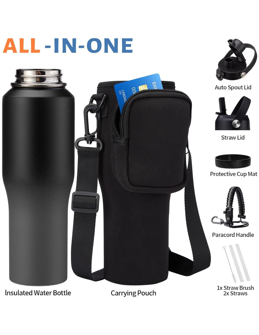 - PORTABOTELLAS DE ALMACENAMIENTO Y BOTÍN: El transportador de botellas de agua con un gran bolsillo con cremallera para guardar tus tarjetas, llaves o efectivo. El botín de silicona para botellas de agua proporciona protección adicional para tu botella de agua de 32 oz (0,95 L) con pajilla.