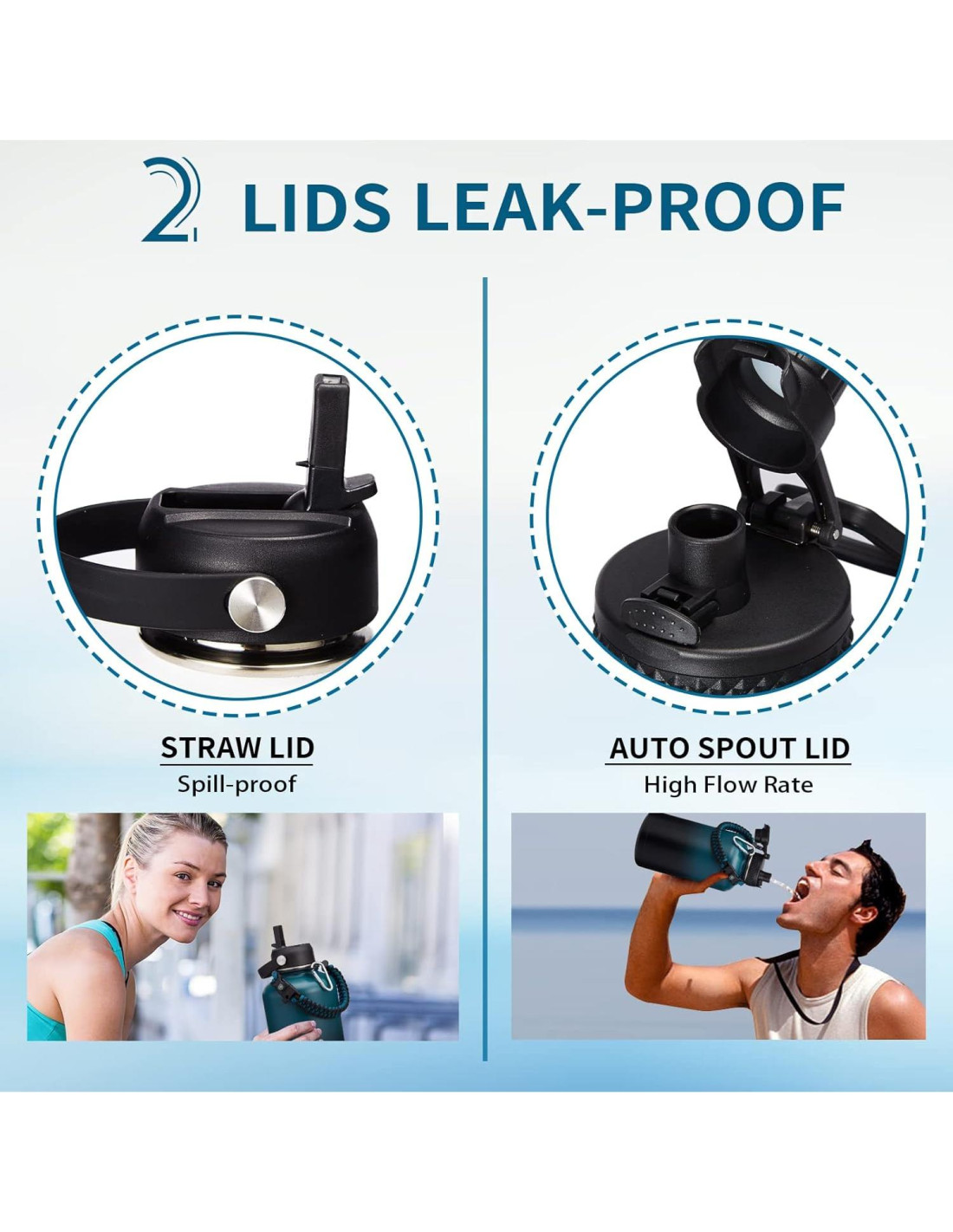 - TAPAS A PRUEBA DE FUGAS - TAPA CON BOQUILLA AUTOMÁTICA Y TAPA CON PAJILLA satisfacen tus diferentes necesidades de bebida, y ambas tapas son a prueba de fugas y con asa para llevar. La tapa con boquilla emergente cuenta con un botón para abrir rápidamente con una mano, y una gran salida de agua para beber rápidamente. La tapa con pajilla te permite disfrutar de un sorbo perfecto sin derrames en todas tus aventuras al aire libre, también puede prevenir la inhalación de cubitos de hielo