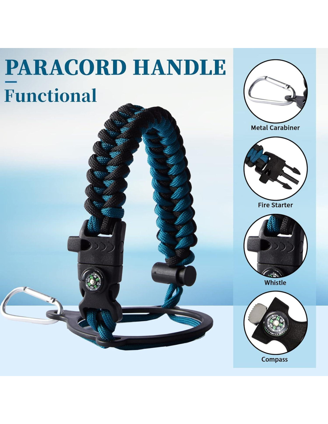 - BOTELLA PERSONALIZADA CON ASA DE PARACORD - Botella de agua termo con un asa de paracord funcional bastante genial que hace más de lo que parece. La cuerda de supervivencia hecha de nylon de grado militar, con brújula, lazo de seguridad, mosquetón de metal, pedernal, encendedor y silbato. Puede ayudarte si te encuentras en una situación de supervivencia mientras haces senderismo, acampando o en la vida cotidiana