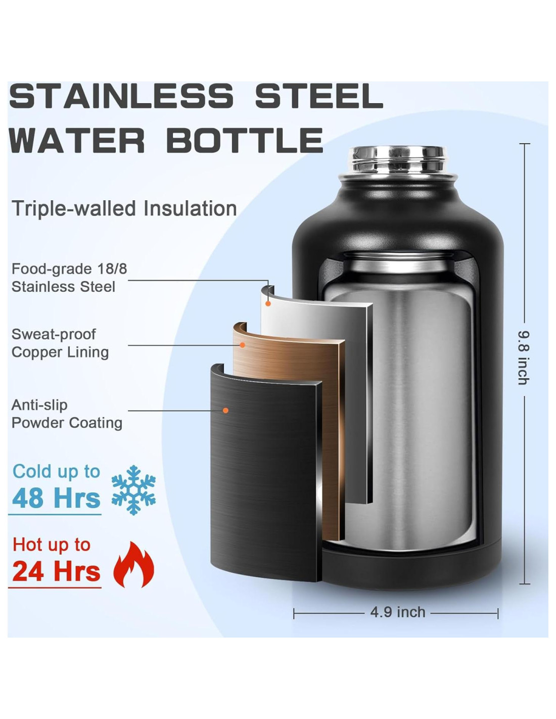 - Aislamiento de Triple Pared - Botella de agua de 1/2 galón a prueba de sudor con aislamiento al vacío de triple pared con revestimiento de cobre que mantiene las bebidas heladas hasta 48 horas y calientes hasta 24 horas.
