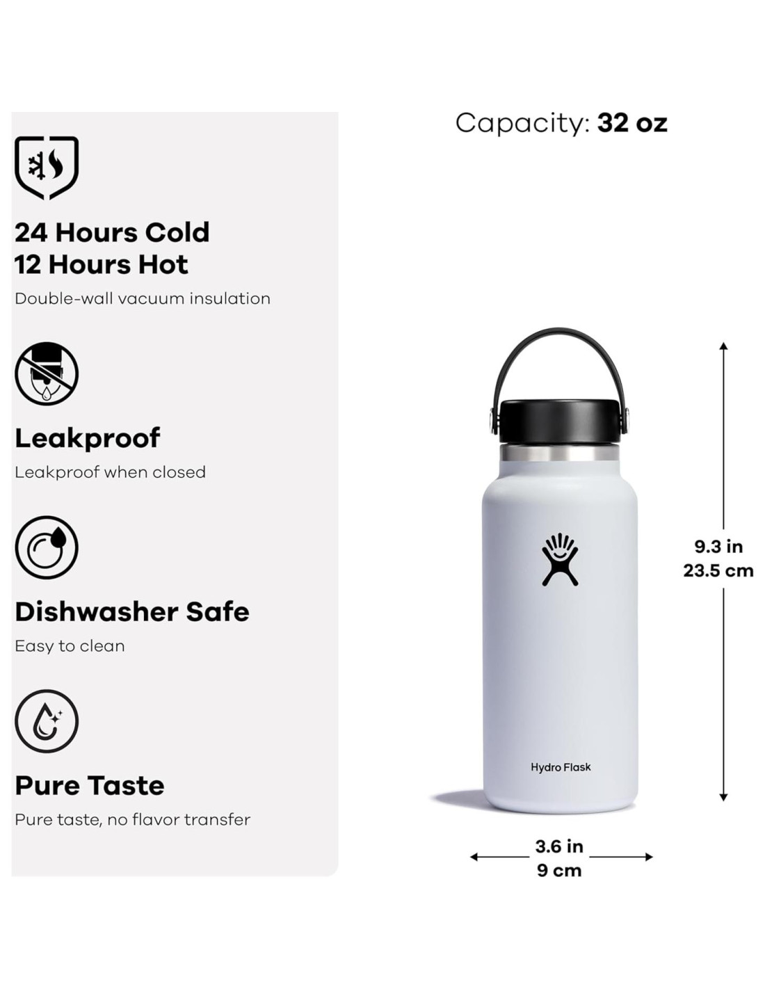 - BOTELLA DE AGUA DE 32 OZ: La botella de agua reutilizable de acero inoxidable aislada mantiene las bebidas frías durante 24 horas y calientes hasta 12. Esta botella Hydro Flask es apta para lavavajillas y fácil de limpiar.