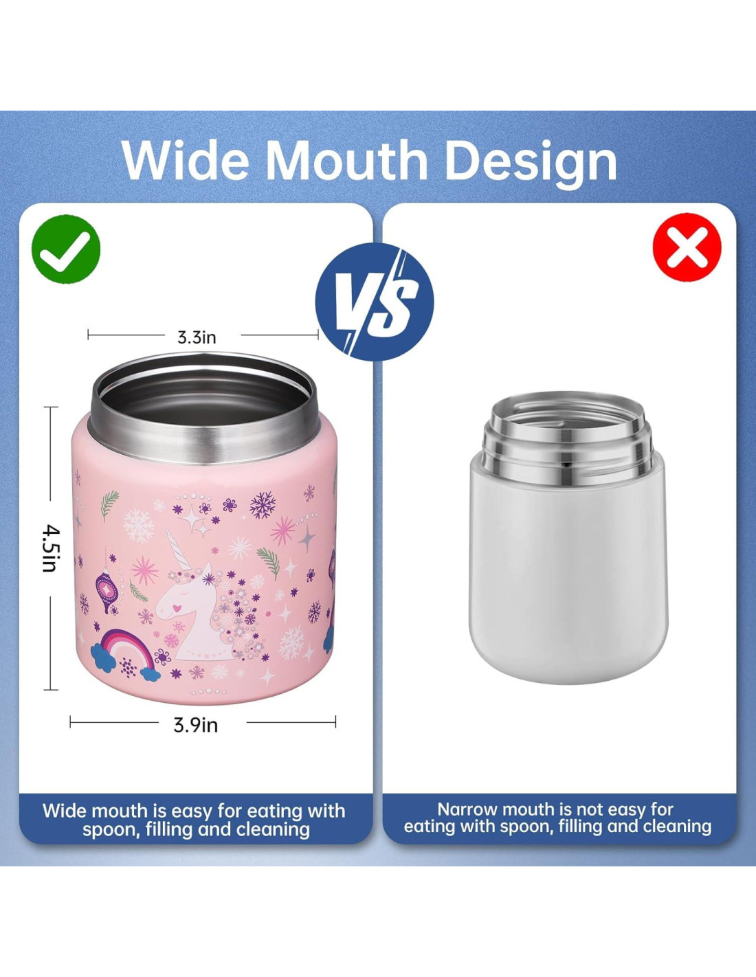 - Boca Ancha para Niños: Nuestro termo para niños pequeños está diseñado pensando en la conveniencia, con una boca ancha para un fácil acceso a la comida, sopa, fruta, helado o cualquier otro contenido que desees llenar. La boca ancha y el interior suave aseguran una limpieza sin esfuerzo, mientras que el labio de silicona a prueba de fugas se puede quitar fácilmente para una limpieza a fondo.