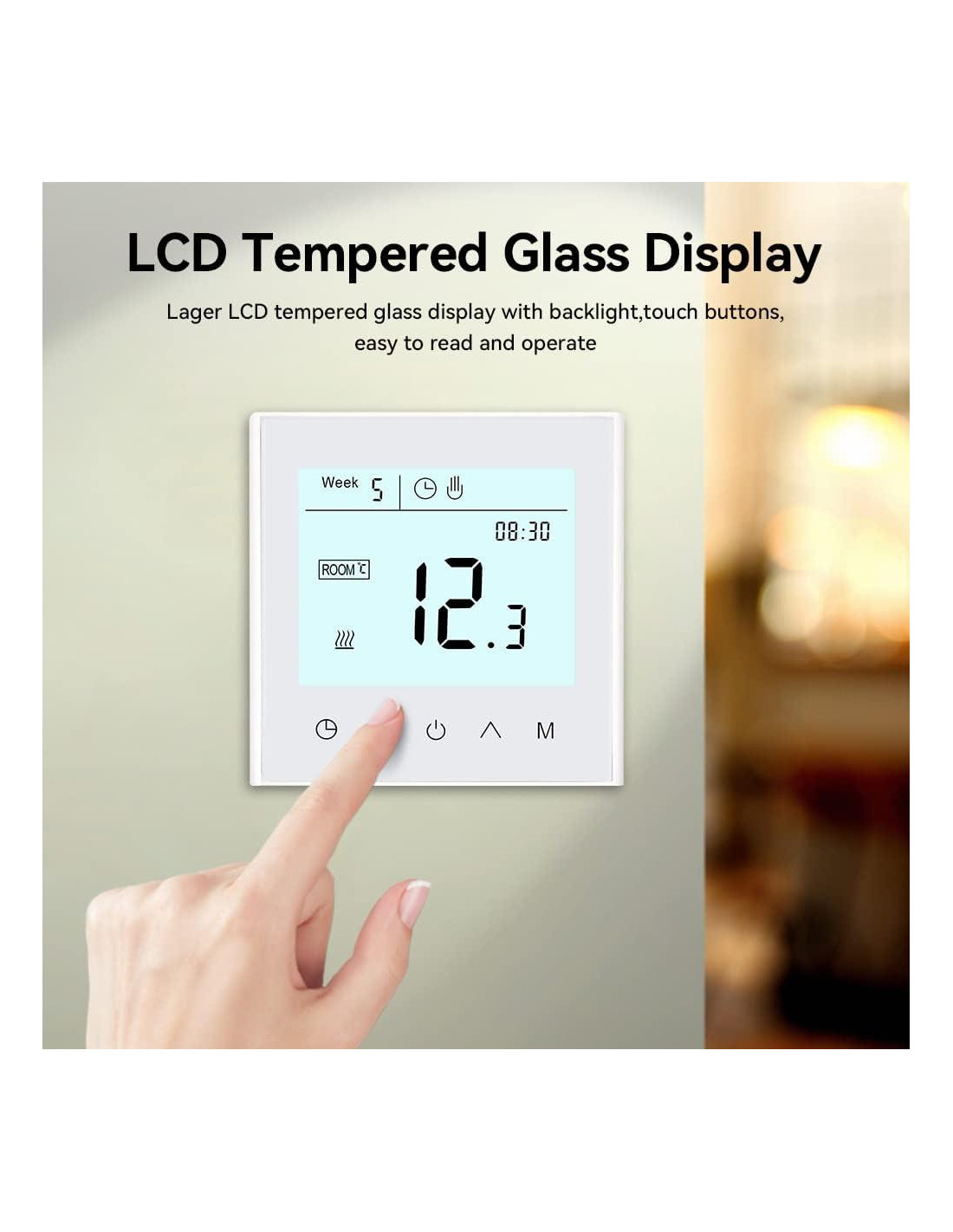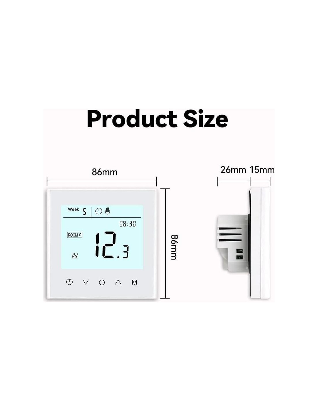 - Paquete Incluido: 1 x termostato, 2 x tornillos de montaje, 1 x instrucción en inglés, 1 x sonda de sensor de 3 metros (solo para calefacción eléctrica de 16A)